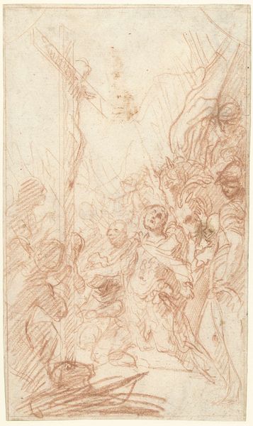 Curator: Simone Cantarini's “Nymphs Bathing,” created sometime between 1642 and 1648, is a red chalk drawing on paper, currently held at the Art Institute of Chicago. Editor: It's lovely. A little chaotic at first glance, but there's a palpable sense of life and energy. Curator: I'm particularly drawn to the composition itself. Notice how Cantarini uses the red chalk to create dynamic, swirling lines that define the figures and suggest movement. The composition guides our eye, emphasizing the interplay of light and shadow across the figures' forms. Editor: The depiction of nude nymphs immediately makes me think of historical power dynamics. Who is allowed to represent the nude form, and whose bodies are omitted from these artistic traditions? How does the male gaze come into play when assessing such an image? Curator: The very looseness you pointed out might be relevant here. I think Cantarini masterfully uses line quality. He balances delicate strokes with heavier, more defined contours, thus achieving depth and volume while still retaining an airy, sketch-like quality. Look at the nymph in the foreground – her pose seems natural yet subtly idealized. Editor: Right, because of course, these historical depictions, like the "natural yet subtly idealized" female body, often obscure lived reality behind a smokescreen of imposed societal ideals. Do you see any subversive messaging? Or is it rather about Cantarini perpetuating—perhaps even reveling in—the male gaze? Curator: I don't know if subversive messaging would be appropriate here, but consider this: this is likely a study for a larger painting. So, in viewing this drawing, we get to witness the artist's creative process, the genesis of a more complete artwork. This level of intimate detail invites closer study of how Cantarini constructed ideal forms. Editor: And it gives us space to reflect on who benefits from these constructions. Examining these images requires constant contextual interrogation. Art exists in the cultural here and now, despite the time period depicted or its creation date. Curator: An important reminder indeed. The formal analysis, though vital, isn’t sufficient to encompass a work's full complexity. Editor: Exactly! These pieces ask the audience questions, consciously or unconsciously.