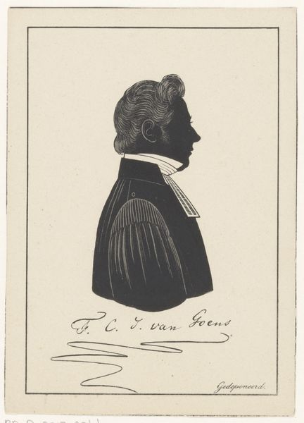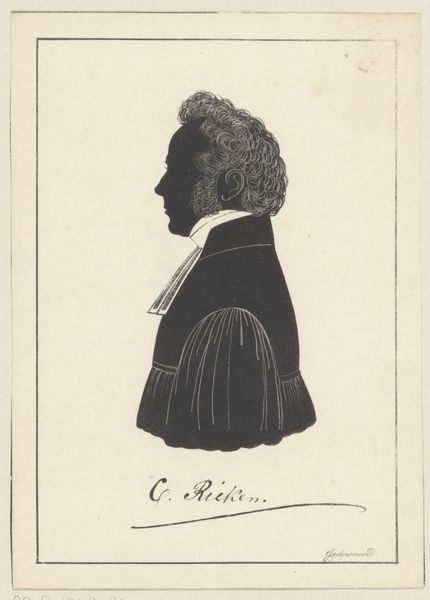 Friedrich Heinrich Wilhelm Schröder made this silhouette portrait of Daniël Serrurier using cut paper. The stark black against the white background makes the image striking. The silhouette is an interesting process. It's all about negative space, what's cut away rather than what's left. Notice the evenness of the black, and how it flattens the subject. Schröder probably used a sharp blade to achieve these clean lines. It’s a relatively quick process, certainly much faster than painting a portrait. Silhouette portraits were often considered a more affordable alternative to painted miniatures, making them accessible to a broader segment of society. Think of it as the Instagram of its day! They were a popular form of personal documentation, offering a glimpse into the sitter’s likeness and status. Looking at this object, it’s important to remember that materials, making, and context are all intertwined, giving an artwork its full meaning. This challenges traditional distinctions between fine art and craft.