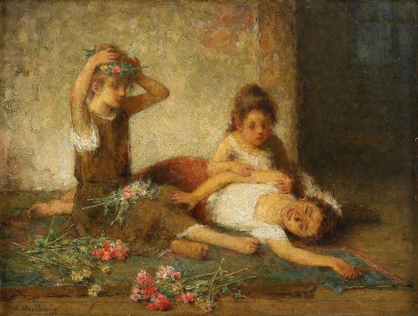 Editor: This is Félix Ziem’s “Le harem,” painted in oil sometime between 1855 and 1856. I find the hazy brushstrokes and subdued palette create a rather dreamlike atmosphere. What structural elements do you find most compelling? Curator: The spatial ambiguity, clearly. Observe how the artist manipulates light and shadow to flatten the pictorial space, almost dissolving the figures into the background. The composition abandons any pretense of classical perspective. Are we looking *into* the harem or simply *at* a decorative arrangement of shapes? Editor: So, the lack of depth is deliberate, drawing attention to the surface itself. Curator: Precisely. Ziem directs our gaze to the materiality of the paint, the expressive potential of the brushwork, and the interplay of tonalities. Note the repetition of curved lines in the figures’ bodies echoed by those suggested in the back walls which contributes to an overall sense of curvilinear dynamism and decorative flattening. Editor: It’s less a realistic depiction and more…an exploration of form. Curator: Precisely. How does the restricted palette impact our experience? Notice how color harmony contributes to a subdued mood, preventing a realistic treatment of form or an anecdotal description of space or of event. Editor: Now that you point it out, the muted colors, blues, greens and yellows are suggestive of an internal reality. It makes it even more dream-like. Curator: Indeed. By focusing on these formal properties, we transcend the potentially problematic subject matter of "orientalism" and focus on Ziem's artistic investigation of form and texture, a direction explored further by impressionism. Editor: It makes me consider how form can carry as much weight as subject matter in interpreting a work. Curator: Absolutely. It provides a solid structure from which we can discuss artworks regardless of context, without any social narrative around.