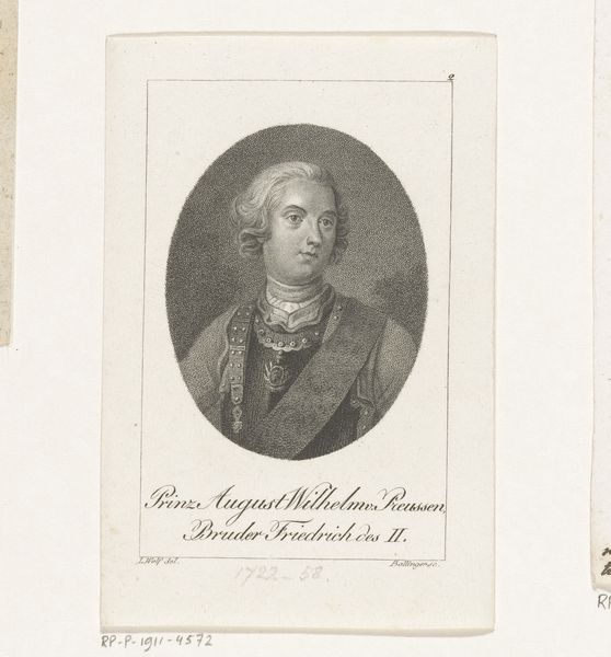 Curator: Allow me to introduce an engraving from the Rijksmuseum: “Portret van Ewald Friedrich von Hertzberg,” dating somewhere between 1786 and 1836, by Johann Friedrich Bolt. Editor: There's an austere quality to it, quite fitting for a man of apparent high standing. The oval framing draws the eye immediately to the figure, compressing the pictorial space in an interesting way. Curator: Indeed. Note the skillful execution. Bolt utilizes delicate lines and meticulous hatching to define form, creating a subtle interplay of light and shadow across Hertzberg’s features. The geometric precision is striking; it embodies Neoclassical ideals of order and clarity. Editor: The medium itself is part of the message, don’t you think? An engraving—multiple copies could be made with relative ease and at a relatively low price to celebrate Ewald Friedrich von Hertzberg! Its reproducibility democratizes access to this image. We also see here not just the high skill, but also the labor embedded in its crafting. Curator: I would suggest that this accessibility broadens its cultural significance as it enables the wide distribution of a clear vision of state power. It allows the common man to be acquainted with the leading men of the time! This helps to enhance the legitimacy of the system and the leading actors of state, through dissemination, control, and formal artistic qualities that enhance their visibility in popular memory. Editor: That emblem on his chest really pulls my attention, as well, demanding scrutiny—a material object of power, presented so deliberately, yet so passively consumed by those of us standing here and staring now. Curator: The image functions, in essence, as a codified visual language, designed to communicate prestige and power through specific aesthetic conventions. Editor: Ultimately, the artwork reveals an intersection of power, image, and accessibility—it reflects on a moment when dissemination allowed state-sanctioned visuals to solidify an epoch in peoples' imagination, a fascinating dance between materiality and meaning. Curator: An incisive reading! One that highlights the inherent semiotics and their sociopolitical construction.
