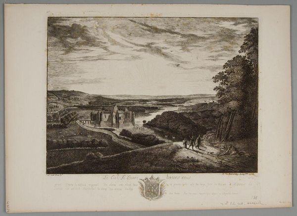 Editor: This is Antoine de Marcenay de Ghuy’s "River Landscape with a Castle and Travelers," created in 1755 using etching and engraving. It evokes a sense of serenity, almost like a stage set, with the figures placed just so. What do you see in this piece? Curator: Let's analyze the structural components. The composition hinges on a distinct separation of space—the castle grounds versus the open landscape. Observe how light articulates the cloud formation to diffuse and soften forms and details in the image, but is also organized by radiating beams to accentuate perspective. How do these contrasting uses of light guide the viewer's eye? Editor: I notice how the beams of light behind the castle highlight it as the center of attention and add an idyllic air. And by contrast, the travellers walking into the light create a natural bridge towards that bright, faraway space... It creates a balance, doesn't it? Curator: Precisely. It isn’t merely mimetic representation. It shows sophisticated compositional choices that guide visual weight and create meaning. The textures achieved through the etching contribute significantly too. Notice the variety in mark-making. Can you articulate how the etcher used these to convey spatial depth? Editor: Yes! Finer lines are in the background to create an impression of distance and scale. Bolder, heavier lines draw closer in, like on the trees... Almost like Baroque staging techniques in a theatre! Curator: It functions similarly, using contrast to engage the observer through both content and the technical decisions underpinning its visual presentation. A very insightful analysis, wouldn’t you agree? Editor: Absolutely! Looking closely at the layering of techniques and their contributions opened my eyes.