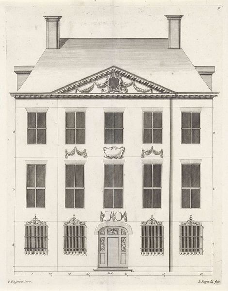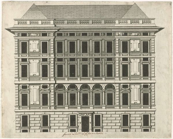 Curator: We're looking at an engraving titled "Huis Koymans Keizersgracht" from 1631. It's currently held in the Rijksmuseum. Editor: Strikingly geometrical. The severe facade above the architectural plan below creates a feeling of order. It’s the kind of image that immediately asks for scrutiny. Curator: Absolutely. The work is significant in understanding Dutch Golden Age urban planning and architectural standards. We see in the rendering here a connection between design and daily life. Editor: Observe the precision of the engraving—the repetition of windows, the careful rendering of the brickwork. How does this reflect the values and aesthetic principles of its time? It embodies visual clarity. Curator: The labor involved in such detailed engraving shouldn't be overlooked. Also, consider who this print was made for. It probably wasn't the working class; its consumption likely aligned with merchants invested in trade and architecture. The print documents wealth and societal stratification. Editor: But does knowing the patron change what we perceive within the lines and form? Focus on composition: the mirroring in both levels conveys a strong emphasis on symmetry and clarity of form. There is undeniable structuralism at play. Curator: That symmetry mirrors a societal desire for order but ignores the workers that built this place and the global trade that funded it. By viewing art through materiality and production we confront those power dynamics. Editor: Fair, and yet one cannot dismiss the formal choices at play—a refined, austere architectural portrait. Its semiotic power lies in the building's structure; each element contributing to an overwhelming sensation of purpose. Curator: Indeed, there's undeniable intention to the image; however, recognizing labor challenges these interpretations, situating this print within real-world, material, and societal conditions provides fuller insights. Editor: Ultimately, our conversation highlights how formal structures intersect with historical context. Curator: Yes. Examining the art object through both formalism and material processes yields more dimensions of consideration.