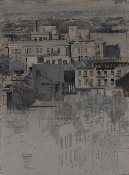 Curator: Immediately striking, isn’t it? This painting, "Townscape" by Gerhard Richter, executed in 1969, offers a rather unusual take on the urban landscape. Editor: Yes, it’s quite interesting. I’m immediately drawn to the palette, the severe use of grayscale... it lends this sense of distance, almost like a half-remembered dream of a city. What's compelling about its stark rendering? Curator: That detached, almost impersonal feel is key. Richter was working in the aftermath of the Second World War. This period significantly shaped artistic perceptions of the urban environment. What visual memories did these fragmented cityscapes create and retain? Editor: So the muted tones and simplified forms serve a dual purpose: aesthetic and historical commentary. How does it speak to Richter's broader artistic project within the context of postwar Germany? It clearly isn't simple representation. Curator: Precisely. It's more a commentary on how photographic imagery mediates our understanding of the world around us. These aren't idealized monuments; they are representations of reality mediated through a lens, printed in newspapers. Think about the architectural motifs - flattened facades, repetitive geometries. The painting strips away detail to leave only the skeletal essence of urban life. He reveals something deeper: the psychological impact of modernization. Editor: The almost geometric nature feels connected to Modernism but there is also a Pop Art sensibility, with what appears to be abstracted photographic imagery. Was he attempting to reconcile these apparently contradictory impulses? Curator: Absolutely. In the context of pop-art the cultural symbol of urban landscape creates an unsettling blend. This fusion reflects the uneasy transition of post-war societies grappling with historical traumas while trying to participate in modernity. What unspoken connections surface here? Editor: Looking at it again, I am also drawn to how "Townscape" invites reflections on societal memory and identity. I guess that cities are repositories for the experiences of populations that constructed them over time, right? Curator: In a world shaped by conflict and reconstruction, art had a critical role to remember collective memory and cultural continuation. The urban landscape could serve as a site where the past is constantly negotiated and where modern culture might rediscover some depth of understanding. Editor: So what at first appears like a detached cityscape contains a web of social, psychological and cultural implications. Thank you, the piece resonates on a much more reflective, human level now. Curator: Exactly! Hopefully this encourages us all to examine the symbols of modernity critically, acknowledging their emotional and historical reverberations.