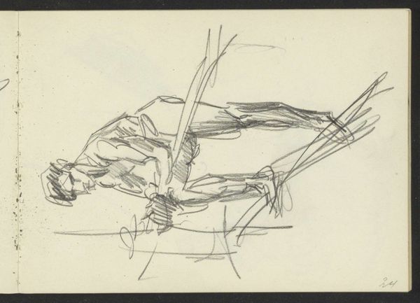 Curator: Welcome. We’re looking at a work by Isaac Israels, titled "Standing Woman, Possibly in Bathing Suit". It’s a pencil and ink drawing that likely dates from between 1875 and 1934. You can currently find it here at the Rijksmuseum. Editor: It looks like a fever dream! I mean that in the best way. The lines are so raw and energetic, it feels like he's captured a fleeting moment, a memory almost dissolving before our eyes. It has that upside-down quality; like when you're a kid hanging off the sofa, looking at the world from a completely different perspective. Curator: That sensation of a dissolving memory is interesting. Israels belonged to a generation of artists attuned to the transience of modern life. His depictions of women are especially insightful when considered against the backdrop of rapidly shifting gender roles at the turn of the century. Editor: Exactly. It’s like she’s caught mid-transformation. Is she emerging from water? From sleep? From a previous version of herself? The pose is almost acrobatic, suggesting both vulnerability and a hidden strength. There's definitely something about her presence; a hint of defiance in this uninhibited display. Curator: We might explore that "defiance" by positioning the work in the context of contemporary debates around female representation and the male gaze. While nude studies have a long history, Israels’ quick, almost secretive sketching suggests a more intimate encounter, rather than a formal, academic exercise. We can interpret the drawing not just as a representation of the female body, but a commentary on the act of observing it. Editor: Well said. It certainly avoids any kind of idealization. The imperfections, the unfinished quality, are all part of what makes it feel so…honest. There’s a refreshing lack of pretense here, as if Israels were more interested in capturing the feeling of being alive than achieving some polished, flawless depiction. For me, it feels more like looking in a mirror than into a painting, capturing both awkwardness and possibility. Curator: It really does push beyond the aesthetic norms to provide valuable social commentary. Its immediacy forces us to reconsider the narratives we impose and appreciate both vulnerability and force, especially as experienced by the women who inspired this piece. Editor: Indeed. It has a curious effect. After close inspection, I think it reveals more about our own projections than Israels' intentions, and ultimately that's why it stays with you long after you walk away from it.