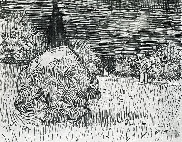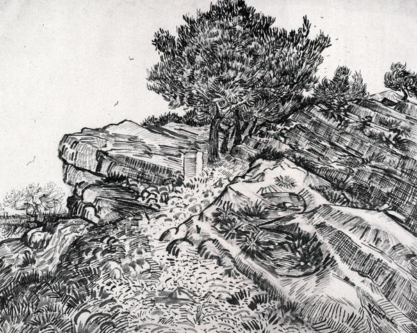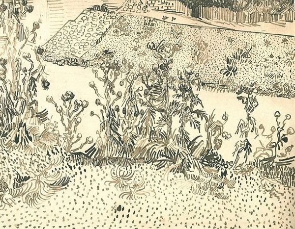 Editor: This is Van Gogh’s “Field with Bare Tree,” created in 1889 using pencil and graphite. The sketch evokes a quiet sense of isolation. How would you approach interpreting its stark imagery? Curator: Formally, observe the stark contrast between the dense, textured foreground of grass and the relatively sparse rendering of the field and bare tree. The use of frottage, evident in the subtle variations of tone, creates a tactile surface that engages the viewer. Consider the lines themselves—short, repetitive strokes building the foreground, longer, more deliberate lines defining the tree. How does the artist create depth with such limited means? Editor: I see how the varying pressure of the pencil creates a sense of texture, almost making the grass seem to move. What's the significance of the bare tree as the focal point? Curator: The tree, devoid of foliage, functions as a structural anchor, directing the eye and fragmenting the pictorial space. Note the branching structure. Does the artist's manipulation of line quality and the distribution of value affect your reading of the tree as an isolated form? The composition guides our eye, shaping our experience. Editor: That's fascinating; focusing on how the elements are put together helps understand what's being communicated. I had originally thought the bareness meant the drawing felt depressing, but I hadn’t examined how depth and movement are captured within the stark composition. Curator: Indeed. The expressive power lies not in a direct representation of a scene but rather in how the artist’s choices guide our visual perception and emotional response. Consider, therefore, the pure relationship of form and line.