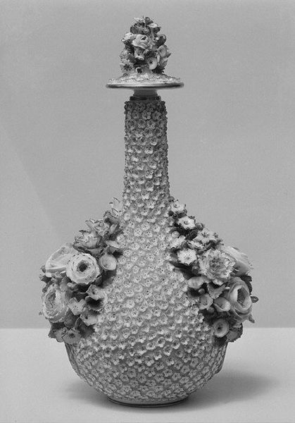 Editor: Here we have a charming little "Bon-Bon Vase," dating back to 1800, crafted by Eiraku Hozen. It's ceramic, residing at the Metropolitan Museum of Art. I'm immediately drawn to its gentle, almost shy, presence. Those swirling, low-relief designs give it such an intimate, tactile quality. What whispers to you when you see this, Curator? Curator: Oh, "whispers" is perfect! It reminds me of a forgotten melody, something heard through a closed door. The ceramic is a kind of skin, isn’t it, hugging the form, each tendril a thought made solid. You know, Hozen lived during a period of artistic revival, and his work always strikes me as a dance between tradition and newfound freedoms. Doesn’t the intricate detail evoke the past, while the smooth curves suggest a playful lightness? What secrets do you think it held? Perhaps it lived a past life on display for visiting dignitaries and wealthy merchants, showcasing confections, as the name implies. Editor: That tension is really palpable now that you mention it! The swirling detail looks almost organic. And the contrast between its potential uses is so evocative. I can imagine something as extravagant as sugared almonds, or maybe something simpler, more personal - love letters? Does this kind of craftsmanship tie it to similar works of the time? Curator: Absolutely. These types of forms with raised patterns link back to even older Asian traditions, yet the elegance is pure Hozen. But more than technique, it’s the feeling, right? It's that sense of a contained world, hinting at the secrets we carry, the beauty we choose to reveal. Editor: I love that—"contained world.” Thanks for illuminating its layers, Curator. Curator: My pleasure. I’ll think of it now every time I'm curating secrets in a box in my office. It has changed how I experience that piece, as well.