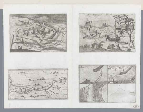 Curator: Johann David (I) Schleuen created this piece, "Zondvloed, omringd door uiteenlopende voorstellingen," in 1784. It's a print, using etching and engraving techniques. What’s your immediate reaction? Editor: The overall composition strikes me as remarkably... busy. There's almost a storyboard quality to it. The level of detail within each framed vignette, rendered through etching and engraving, feels almost frantic given the grand theme. Curator: Exactly. The ‘Flood’, or “Zondvloed,” is surrounded by disparate scenes. It functions almost as a meditation on destruction, framed through both biblical narrative and scenes of everyday labour. The individual vignettes pull at different historical and social contexts, hinting at a psychological landscape. Editor: It makes me consider the material conditions of production here, not just the image depicted. Etching and engraving are painstaking. How does that labor translate into this depiction of overwhelming catastrophe? I wonder about the social context of printmaking at the time—was this a common way to circulate apocalyptic imagery? Curator: Certainly. Prints were, then as now, a potent vehicle for disseminating ideas and narratives. But I think here the imagery suggests a deeper anxiety, the psychological weight of facing catastrophic events. Notice the figure seemingly taking measurements. What might that suggest? Editor: The measuring figure...Perhaps an early attempt at quantifying, at controlling forces that ultimately prove uncontrollable. Thinking about the raw materials themselves – the metal plates, the inks – the permanence of printmaking contrasts starkly with the ephemerality of the moment this piece is describing. It's an intriguing tension. Curator: Absolutely, there is the notion of control and, on the other hand, the notion of chaos and losing control. The ark seems almost incidental amid a multitude of earthly scenes of disaster. A final thought...how does this cultural memory find resonance within us today? Editor: The imagery of displacement, loss, and futile human action against a destructive force... sadly, it's eternally relevant. Examining the process reminds us art-making is a job with skills acquired in time, like other means of labor that it reflects. It’s a potent image indeed.