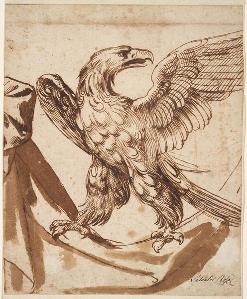 Editor: This is P.C. Skovgaard's "Singing Lark. Decorative Draft," likely made between 1817 and 1875, an ink drawing on paper. It has a very light, almost airy quality. What strikes me is its simplicity, but it feels full of potential. What do you see in this piece, especially considering the period it was created? Curator: Well, first, it's interesting to think about this work not just as a sketch, but as a "decorative draft." It speaks to the shifting role of art in society during that period. Was this meant for a public building, perhaps? Skovgaard was working in a Denmark undergoing significant national romanticism. The lark itself is a symbol, isn’t it? A symbol often associated with springtime, hope, and even national identity. Think about its potential as part of a larger decorative scheme. Where would you envision such a motif appearing in public life? Editor: I could see it in a public hall, or even as a design for textiles. The national romanticism angle makes a lot of sense, connecting to ideas of freedom and nature, maybe a growing sense of cultural identity. Is this kind of patriotic symbolism common for Skovgaard? Curator: Indeed. Skovgaard is a key figure in establishing a distinctly Danish landscape painting tradition. He, along with others, depicted the Danish countryside as a source of national pride and identity. By focusing on the lark, he's not simply showing us a bird, but connecting that bird to larger cultural narratives. Also, the sketch itself is accessible. Not high-art. It is populist, suggesting public function. Editor: So the choice of subject and its accessibility point to the potential democratization of art. Something meant to uplift collective spirit. Curator: Precisely. And even a preparatory drawing can embody this social function, making it relevant for broader societal engagement. Any artist makes choices relative to socio-cultural context. Editor: This reframing has opened up my perspective considerably! Thinking about how artistic expression is shaped by cultural movements, not just personal intention, provides richer context. Curator: Indeed. And by looking closer, we find how artworks participate actively within society.