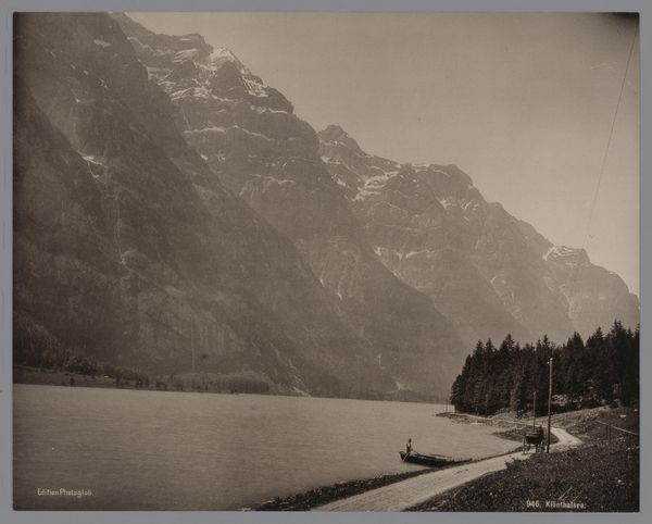 This landscape, whose creator is unknown, captures the Cristallo massif in the Dolomites with the Dürrensee lake in the foreground. It’s a chromogenic print on glass, a technique that yields a distinctive palette and texture. Notice how the composition divides into three horizontal registers, each rendered with a distinct tonal range. The glassy lake dominates the foreground, reflecting the muted tones of the sky. Above, a band of dense forest mediates between the water and the pale, almost ethereal, mountains in the distance. The artist uses a restricted range of hues to enhance the picture's structural clarity, creating depth through tonal shifts rather than vivid color contrasts. What's remarkable here is the interplay between objective representation and pictorial structure. The photographic medium captures a specific location, yet the strategic manipulation of tone and composition transforms the scene into an exercise in visual organization. This is more than a mere depiction; it's an interpretation of space and form.