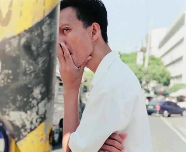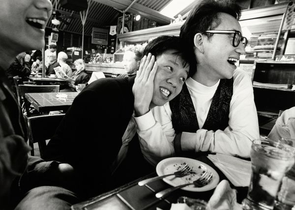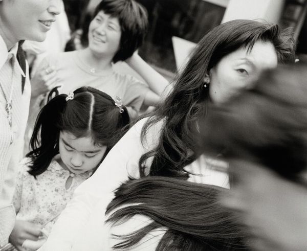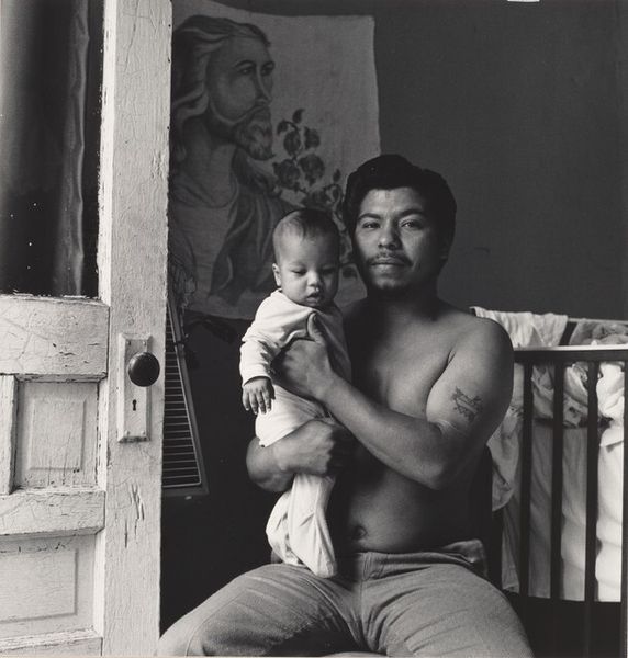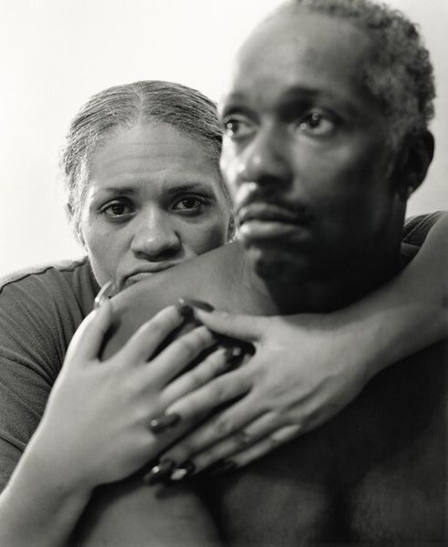 Editor: This is a striking black and white photograph by Nancy Andrews, titled "Rafael and Ana Chang," taken in 1993. The composition feels very intimate. What's your initial impression? Curator: My eyes are drawn to the symbolic weight carried by seemingly simple elements: their placement, expressions, the stark contrast between light and shadow. Look at how Rafael is slightly behind, almost looming, while Ana looks directly at the viewer. This could symbolize a traditional power dynamic, but it could also hint at a quiet strength and a directness in Ana’s gaze. Do you see what I mean? Editor: I do. It’s almost confrontational, but subtle. What about the earrings that they're both wearing? Curator: A small detail, yes, but not insignificant. Earrings, especially matching ones, can denote belonging, a shared identity. Perhaps they are a symbol of their bond, a visual echo reinforcing their connection. In some cultures, specific earrings can be associated with familial status, rebellion, or solidarity. Do you feel that shared identity is a symbol of solidarity here? Editor: Possibly, it certainly hints at connection. Maybe it’s a red herring though. So how do you navigate between objective cultural markers and subjective interpretation? Curator: That's the crux of iconography! We investigate the context, research historical precedents, but ultimately, it's about tracing how visual language has been deployed over time. We can study traditions, we use psychology, and social identity. Even personal memories triggered by the work, like my grandmother wearing similar earrings. That can be very informative to understanding this photograph! Editor: This has given me a lot to think about in terms of cultural memory, and a richer interpretation of a seemingly straightforward portrait. Thanks for pointing out the different perspectives that these portraits carry. Curator: My pleasure! And remember, the image lives in the viewer, as well as within its own cultural landscape.