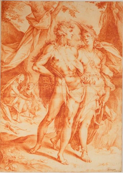 Curator: This drawing is Andrea Boscoli's "Annunciation," done sometime around the late 16th century. There's such a sense of movement, right? The angel seems to burst into the scene. Editor: It's true, that bold hatching gives it real energy. But I keep coming back to Mary's averted gaze. It speaks to a complicated negotiation of power, doesn't it? Curator: Absolutely. And you see it too in the way Boscoli uses the red chalk. The color feels so… earthly, yet the subject is anything but. Editor: Red chalk also makes me think of blood, sacrifice… the very human consequences of divine will. I'm struck by how Boscoli hints at these tensions. Curator: It is a powerful piece, but I see it more like a dream, a moment of divine intervention. Editor: Indeed, but I am always looking to unpack the social meaning of these interactions, especially the power dynamics at play. Curator: I guess that's where our different perspectives bring this drawing to life.