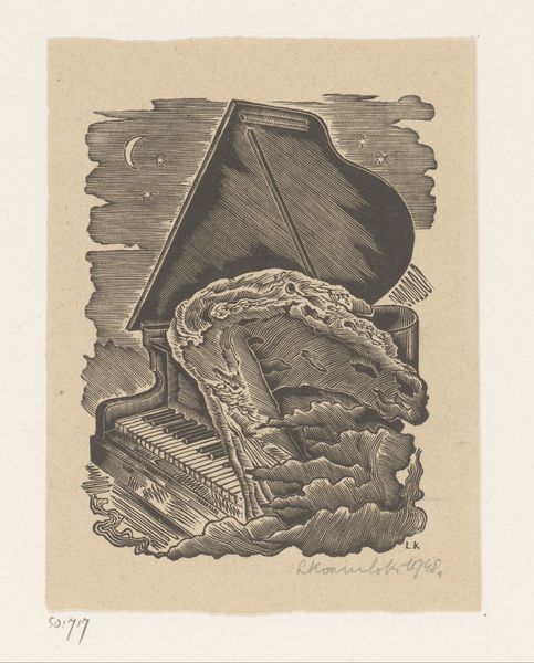 Curator: Well, this engraving, titled "Koggeschip met wapen op het zeil" roughly translated to "Cog Ship with arms on the sail" comes to us from Valentin le Campion and was created sometime between 1871 and 1952. The medium is listed as mixed media, with the techniques including printmaking, woodcut and engraving. It definitely carries a unique energy! Editor: Ah, yes, it feels incredibly deliberate and sort of serious. I can imagine the artist, or perhaps even the vessel, preparing to sail to distant, unknown and maybe even dangerous lands! I feel the spirit of early-modern naval power through this monochrome picture. It must have taken hours, no, DAYS of focused, unwavering attention to cut this from a wooden block! Curator: Absolutely. And the shading itself works with the interplay of light and shadow on the water to evoke a powerful, and potentially intimidating presence. The detail given to the patterns on the ship’s sail seem intended to evoke not just strength, but even cultural heritage or family lineage as something powerful in its own right. You notice how much is packed in to a single, simple ship! Editor: Indeed, the sails themselves have that emblazoned heraldry upon them. Look how this all combines. It almost becomes a symbol, you know, of trade and empire meeting head-on. Even the shape of the vessel cuts into the page like the blade of the sword cutting across the surface of a table. What a bold and intriguing image! Curator: Well, the “Koggeschip”, or "cog ship", had considerable weight, both literally and figuratively, at the time! As we see in this rendering by Valentin le Campion. And to reiterate, its construction using both engraving and woodcut printing techniques creates a fascinating combination of textures that make us look twice. It truly underscores your feeling of power—doesn't it? Editor: It certainly does. Every stroke seems imbued with history. Considering that heraldry, do you suppose the intention was to glorify the specific individuals who used the vessel in their voyages of exploration, commerce or war, perhaps all three at once? I can certainly see that! Curator: Likely it's the idea of glory in itself that takes hold. Looking at its patterns, I find it so interesting how this koggeship evokes pride, ambition, and the allure of unexplored worlds, with a somewhat threatening aspect mixed in. Le Campion did capture much in such a small artwork. Editor: That’s what I think as well. And I must add how much the work speaks of time. So next time you encounter an image like this, listeners, try to contemplate where its symbolism comes from and what those hidden symbols might really mean. It makes all the difference in understanding how history lives on within the picture itself!