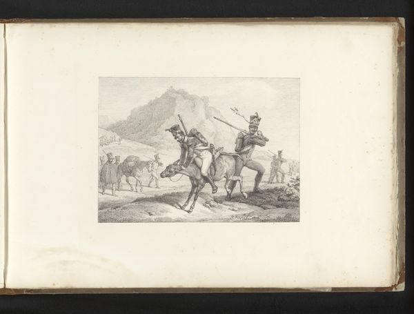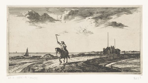 Curator: Here we have Jacob Ernst Marcus’ “Landschap bij stormachtig weer”, or “Landscape in Stormy Weather,” an engraving dating to 1807 and residing here at the Rijksmuseum. My first impression is one of muted drama; there is tension and a certain bleakness about the scene, rendered beautifully with such detail. What are your initial thoughts? Editor: Well, the obvious thing is its material being—engraving on what I presume to be laid paper, which would've been produced laboriously by hand. Look how he exploits the inherent linearity of engraving, turning it into visual energy as well as tonal variation. One thinks about the cultural function of printmaking: a mode of production accessible and disseminated among wide audiences… Curator: Certainly. But I think the choice of medium enhances the inherent Romanticism, capturing a very specific atmospheric pressure—note the bowed tree and frantic figures on the left, or even the slight anxiety rippling through the horse’s body. This speaks to larger allegories; the smallness of humanity against the sublimity and indifferent power of nature. Editor: But there’s something rather *staged* about it too. We’re encouraged to read “pathos,” but the composition guides the viewer a little *too* efficiently from the foreground drama, through a pleasant landscape, ending at the implied economic prosperity embodied in the ship. Curator: That controlled gaze reflects, I think, something of a shift away from earlier landscape traditions; there’s an implicit humanism within it. He’s not simply representing a neutral vista. What do you see in these groupings? We have two struggling figures, and then the figure on horseback leading his own. Editor: A stark visual economy between burden and relative privilege… though everyone seems a bit troubled! One imagines each figure performing a necessary social labor; the figures being carried appear unwell, needing physical care and possibly on route for religious succor within the nearby steeple? The sailor seems like a merchant. The engraving could speak to something about the increasing wealth disparity with mercantile exchange during that era, even? Curator: A strong reading, I agree—and how powerful that a seemingly “simple” landscape manages to weave so many symbolic, historical narratives. The very human thread that underscores our existence is not an individual but a communal event. What have we taken away from this particular print, today? Editor: For me, it reaffirms the radical potential of printed images; seemingly straightforward at first glance but ultimately a powerful medium for distilling complex social relationships, class dynamics, and inequalities within a time.