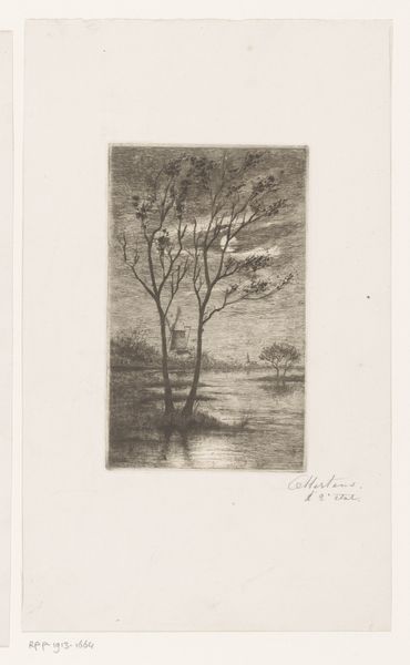Curator: Let’s take a moment to consider "Landscape with pollard willows and two birds in the reeds", a print by Theodoor Hannon, likely created between 1861 and 1910. Editor: Immediately, I’m struck by the texture. It's almost tactile, despite being a monochrome print. You can feel the wind through the etching, the chill in the landscape just by looking at the cross-hatching. Curator: Yes, the etcher's line really animates the scene, doesn’t it? This work fits into a broader interest in rural life, something artists were exploring as industrialization changed society. Prints made art more accessible and catered to new markets eager to have views of landscape available to view in their home. Editor: Definitely. And you can tell by the medium it's intended for broader appeal. The paper support emphasizes its practical role, more than just high art on display. How do you see the choice of etching influencing our interpretation of the scene? Curator: Well, etching allowed for relatively easy reproduction, making Hannon's landscapes more widely distributed and consumed. It catered to a growing middle class wanting a taste of the countryside. Editor: I also find the subject choices so interesting. It is just knot willows and reeds. Nothing extraordinary, yet he makes them monumental through detail. I am curious about how artists obtained etching plates and other materials and what labor practices made this work possible. Curator: Good point. The art market's expansion also affected the artist's choices, responding to increased interest in picturesque landscapes. And these humble landscapes really took off as consumers distanced themselves from increasingly crowded cities. Editor: Precisely. Hannon elevates everyday life and shows nature prevailing in the face of these encroaching changes, demonstrating a material tension reflected by societal pressure. The final composition then serves as both an expression of craftsmanship and cultural ideology. Curator: It’s fascinating to view Hannon's print through these intertwined lenses. Considering the materials used alongside the social conditions gives such rich insight. Editor: I agree. Thinking about materiality enriches our appreciation, revealing stories of culture embedded in artistic production.