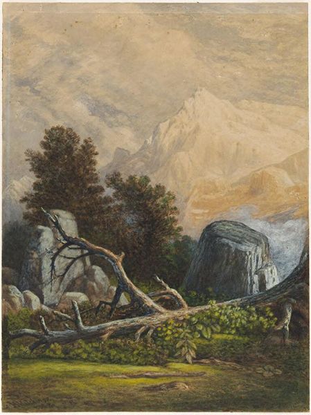 Editor: Here we have Albrecht Altdorfer’s "The Large Spruce," created around 1522, employing oil and tempera on vellum. I’m immediately struck by the dominating presence of the tree, and the intricate detailing in the depiction of nature. How do you interpret the composition of this piece, particularly the way Altdorfer contrasts the micro and macro elements? Curator: Indeed. Altdorfer’s work exemplifies a fascinating dialogue between minute detail and overarching structure. Note the compositional strategy: The assertive verticality of the spruce, segmented into precise planes by his delicate use of light and shade, creates a structural anchor. Yet, Altdorfer allows the gaze to wander through subtle recession toward the landscape, almost denying our reading of linear perspective, and then refocusing it towards this organic object, effectively denying our need for perspectival organisation, and asserting an autonomous naturalism. Editor: So, it's less about representing reality and more about presenting a constructed visual experience through form and composition? Curator: Precisely. One can see in Altdorfer an attempt to subvert our assumptions and structural organization of the work, but by purely formal methods. Editor: That makes me rethink my initial reaction. It’s not just a landscape, it’s a deliberate play with spatial relationships. Curator: I find myself in agreement, there is an interesting play, even deception, that rewards an open mind to new ways of experiencing our spatial perception.