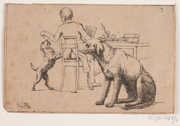 Curator: Before us, we have Vilhelm Kyhn's "Illustration til O. Specter, 'Fabler for Børn,'" created in 1838 using drawing and engraving techniques to produce a print. Editor: It possesses such stark simplicity; the lines forming the figures are minimal, yet it’s incredibly captivating. It feels like a captured memory, almost a stage play in its composition. Curator: That's an astute observation. Consider the symbol of the elephant—a creature embodying memory and wisdom. Its very presence in this depiction suggests a story deeply rooted in cultural understanding. What narrative echoes do you perceive? Editor: I see a narrative of spectatorship. The small group of people looking at the elephant establishes a visual plane. I appreciate the tension between the coarse and fine lines defining form in a subdued and highly contrasted artwork. Curator: The dynamic lies not only in spectatorship but also in the act of learning. An animal of the exotic, being presented for admiration and wonderment—and on the back we find an adolescent displaying an apprenticeship. Editor: Absolutely, the symbolism expands. It invites us to delve into the psychological weight of taming, curiosity, and even power dynamics—all interwoven with the seemingly simple scene. Curator: And note how Kyhn positions us. We are neither entirely within the fable's world nor entirely outside. We're participants in this echo, interpreters of this story. Editor: Looking at the composition once more, there is that almost imperceptible contouring on the subjects of the play suggesting mass. And by association it heightens the mood and drama. What I initially perceived to be a simple scene, turns out to be multilayered upon closer viewing. Curator: Agreed, such are the multilayered depths within even the simplest fable. Kyhn’s Illustration serves as a time capsule, encapsulating cultural perspectives on nature, storytelling, and knowledge itself.