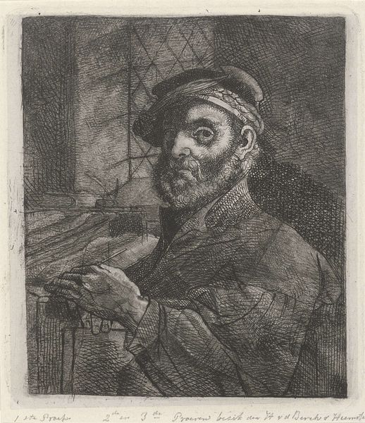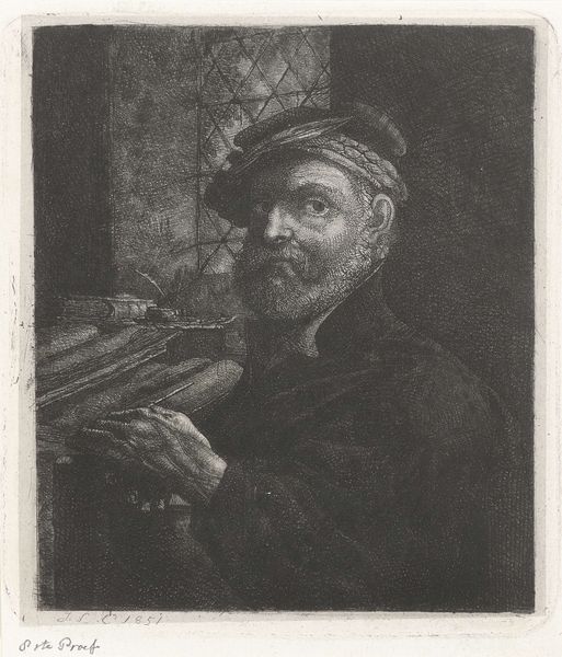 Jacobus Ludovicus Cornet made this etching of an unknown man in 1851. The composition reflects a broader fascination in the Netherlands with portraiture and genre scenes. Here, the sitter's contemplative gaze and the presence of books might suggest intellectual pursuits. In the Netherlands at this time, class structures, religious affiliations, and burgeoning nationalism shaped artistic patronage and subject matter. Artists often negotiated these forces, sometimes reinforcing social norms, and at other times challenging them through subtle visual cues. For example, the sitter's modest attire can be read as a statement of middle-class values. Art historians employ various research methods—archival work, social histories, and cultural studies—to interpret such works, shedding light on the intricate relationship between art and the societies that produce it. Through these methods, we can see art as an expression of broader social, economic, and political contexts.