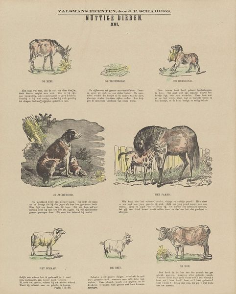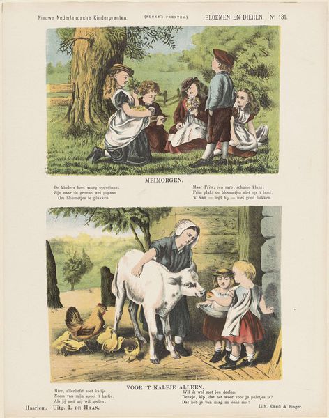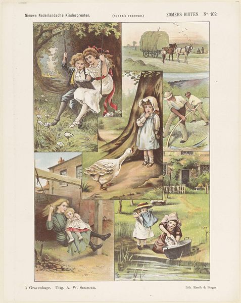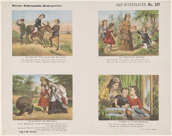 Editor: This print, titled "’T Landleven," meaning "Country Life," is an etching by De Ruyter & Meijer, dating to 1874. It has a whimsical, almost childlike quality, like something from a storybook. What story do you think it is trying to tell, or more specifically, what do you see here? Curator: I see the rising popularity of genre painting meeting the burgeoning print market aimed at a growing middle class. Note how these scenes of rural life—children playing, tending animals— romanticize folk culture, turning it into a spectacle for urban audiences. It projects an ideal of simple, pastoral life, quite divorced from the realities of agricultural labor at the time. The placement of this print, its purpose and market, are as revealing as the image itself. What socioeconomic class do you think the imagery caters to? Editor: Well, based on what you're saying, not farmers! Probably middle-class urban families who wanted to feel connected to the countryside without, you know, *doing* farm work. A bit like an early advertisement, then, shaping perceptions? Curator: Exactly! These images weren’t just reflecting reality, they were actively constructing it, reinforcing certain ideologies about labor, leisure, and the 'good life' at a time when industrialization was rapidly changing social structures. Consider how it shapes what "folk-art" means. How do institutions such as museums frame genre painting for visitors nowadays, or do they at all? Editor: So, this isn’t just a cute picture, but a tiny cog in a much larger cultural machine promoting specific social values. Thinking about where it hung, who saw it, and how it was interpreted back then – and now – changes everything. Curator: Indeed. And how it continues to shape how we romanticize folk-art and agrarian life. Now I wonder about what social changes were ongoing in the region that this was sold… food for thought, certainly.