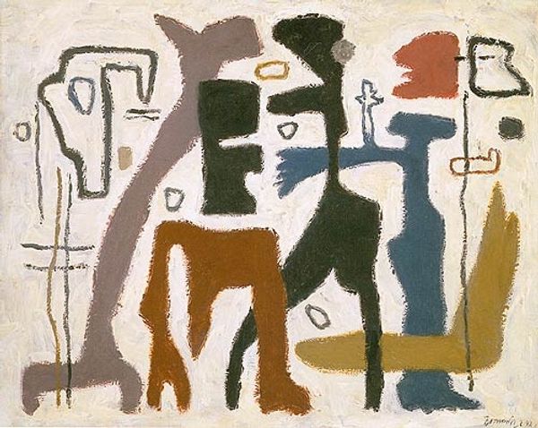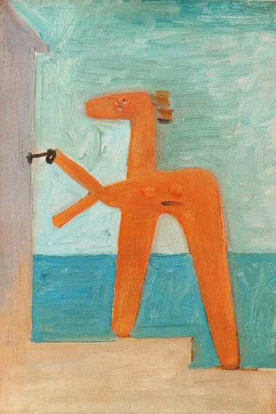 Curator: Here we have Picasso's "Bather," created in 1928, a period where he often returned to themes of the female figure, but rendered through a surrealist and cubist lens. Editor: It strikes me immediately as strangely playful, despite the distorted anatomy. The limited color palette adds a childlike simplicity, almost like a quick sketch capturing a fleeting moment. Curator: That childlike quality is key. After the intensity of his earlier Cubist explorations, Picasso, in the late 1920s, seems to revisit the theme of the bather, connecting it to broader dialogues around primitivism that echoed through art circles. This particular canvas, rendered with oil paint, emphasizes angularity and an almost schematic depiction of the figure. Editor: It’s interesting to consider how this image might be interpreted from a feminist perspective. While seemingly innocent, it's yet another iteration of the female nude through a male gaze, filtered through a modernist, surrealist sensibility. Curator: Absolutely. Context is key. The surrealist movement itself, while often presented as liberating, had its own problems regarding the objectification and idealization of women. This "Bather" contributes to that narrative, however much we might appreciate its formal qualities. Editor: The pose also strikes me as particularly…unstable. One leg stretched back like a tight rope, the other flailing as if losing balance while tossing a ball—a suggestion, perhaps, of the precarious position of women in the societal framework of his time? Curator: One could definitely make that argument, looking at it through the lens of how female bodies were often represented in art—either as passive objects of beauty or as monstrous figures subverting patriarchal norms. There’s something unsettling in how this figure teeters between the two. Editor: I’m left wondering if this 'Bather' is less about the beach and more about deconstructing the very act of seeing, challenging viewers to question how we perceive and represent the human form, especially that of women. Curator: Ultimately, Picasso leaves much open to interpretation. By stripping down the form, he compels us to look beyond the surface and grapple with the complex cultural baggage that art inevitably carries.