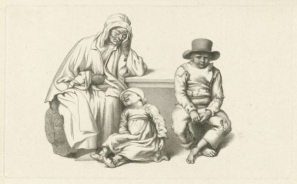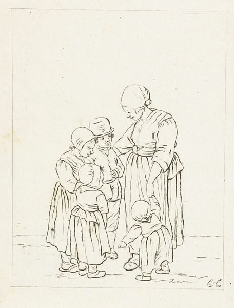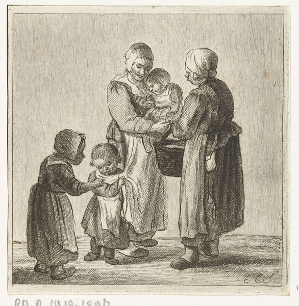 Editor: This is "Moeder met vier kinderen," or "Mother with Four Children," a print made by Pieter de Mare around 1777-1779. It’s an engraving, and it's strikingly… realistic, even a bit somber. What's your interpretation of this work? Curator: It does have a certain gravitas, doesn't it? Almost photographic in its plainness. The lines are so precise, creating texture and depth where you'd expect softness. To me, it speaks to the quiet resilience of motherhood in the 18th century, you know? A mother’s strength isn’t always loud; sometimes, it’s in the everyday, the weariness etched around the eyes. Doesn’t she almost seem to be protecting them? Editor: Yes, there's definitely a sense of protectiveness in her posture. And the children's expressions… they seem both innocent and perhaps a little apprehensive. It’s interesting how the artist captures their different personalities. How do you think this piece would have been received at the time? Curator: I imagine it would have resonated deeply with many. These weren't idealized portraits, but rather slices of life, reflecting the realities of families. Maybe some saw themselves, their own struggles, mirrored in this mother and her children. Then and now, maybe, we all find some piece of ourselves in her struggle to manage. Editor: That’s such a lovely idea. The humanity of it all really shines through. Thank you so much! I’ll definitely look at prints differently from now on! Curator: And I you for showing me new light into an old piece. Keep your eyes open; beauty often hides in plain sight.