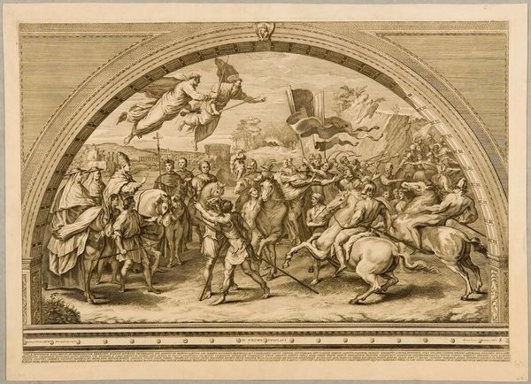 Curator: This engraving, currently held at the Rijksmuseum, depicts "The Meeting between Pope Leo I the Great and Attila the Hun," dating from around 1625 to 1657 and created by Samuel Bernard. Editor: It’s a dramatic piece! All that intricate detail pressed into a relatively small space. I am immediately drawn to the contrast between the chaos of Attila's horde on the left and the serene figures surrounding Pope Leo on the right. What’s most striking is the vision in the sky – angelic figures armed, bearing down. Curator: Yes, the heavenly intervention is a key aspect. The story goes that Pope Leo I, leading a delegation, convinced Attila not to sack Rome. The divine figures wielding swords—Peter and Paul—were believed to have appeared to Attila, deterring him. This moment became emblematic of papal authority and the protective power of the Church. Editor: And that symbolism resonates. The angelic warriors signal a force much greater than earthly power. It almost acts as propaganda, emphasizing the triumph of diplomacy backed by divine right. I’m curious, though, how accurate the historical depiction is. Curator: Historians debate that, of course. The event itself likely happened, but its portrayal is heavily laden with symbolism to solidify the Church’s cultural and political power. Notice how Pope Leo is framed, elevated, almost superhuman, against Attila's advancing army. Editor: Precisely. The print highlights the perceived civility of the papacy confronting the “barbarity” of the Huns. Look how chaotic the Hun’s figures are depicted versus the serenity on the right. Curator: That opposition certainly played well within a European narrative where Rome represented order and the "barbarians" embodied a constant, imminent threat. Even down to the engraving’s inscription; "Als Rey dy Harappelle...". I see its creation as an act of its own, inscribing an ideal narrative into the minds of those who see it. Editor: A fascinating dance between history, belief, and political maneuvering captured in ink! It leaves you questioning the relationship between historical accounts and the deliberate narratives shaped by those in power.