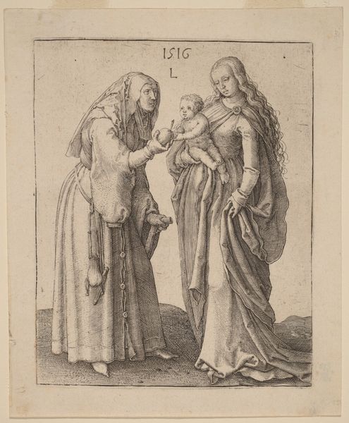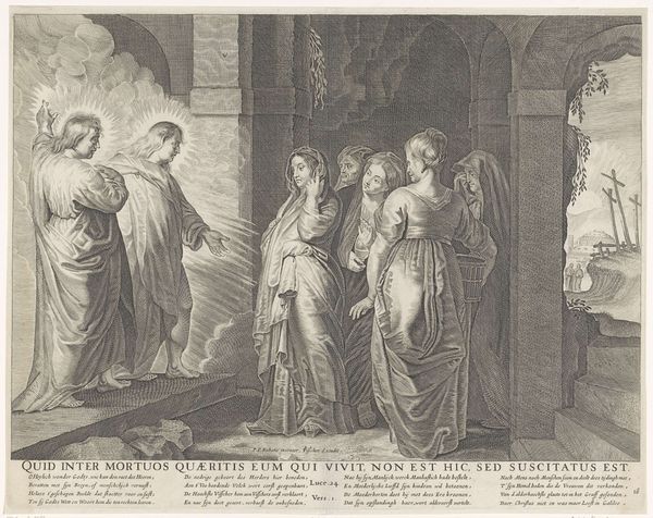 Editor: This is Jan van Troyen’s 1660 engraving, "Maria met het Christuskind, de H. Lucia, de H. Catharina van Alexandrië en twee stichters" – that's "Mary with the Christ Child, St. Lucia, St. Catherine of Alexandria, and two donors," at the Rijksmuseum. The detail achieved through engraving is astonishing; it gives the image a serene, ethereal quality, like a sacred dream. What catches your eye in this piece? Curator: That’s a gorgeous way to describe it, sacred dream indeed. For me, the emotional composition is incredibly compelling, those supplicating donors juxtaposed with the almost nonchalant Christ Child. Don't you think that the baroque drama gets beautifully translated via the engraving process? The light seems to dance across the image, despite being rendered in monochrome! What is your take on this monochrome palette, isn’t that limiting, creatively? Editor: I see what you mean, especially regarding emotional complexity! And about the colour palette, you could feel a lack, but also I think the artist directs your eye to specific areas, creating more focus through shadow and highlights. The viewer focuses on form, texture, and emotion – do you agree with that statement? Curator: Absolutely! It’s a lesson in seeing the world in values, stripping away the color to reveal the underlying structure and light, if you like. What I wonder about, gazing at these engravings, is the narrative that these artists would want to transmit. Is there something special, in your opinion, about it? Editor: I'd say the combination of earthly patronage and divine presence makes it intriguing, with that dynamic between worldly power and spiritual devotion. It really emphasizes the personal relationship with religion characteristic of the Baroque era. Curator: Well observed. It makes you wonder about those donors doesn't it – what were their lives, their hopes, their place within this historical-devotional context? It's always about those questions behind the surface, the untold stories whispering to you, don't you think? Editor: Definitely food for thought... thinking about their identities enriches the experience. Thanks!