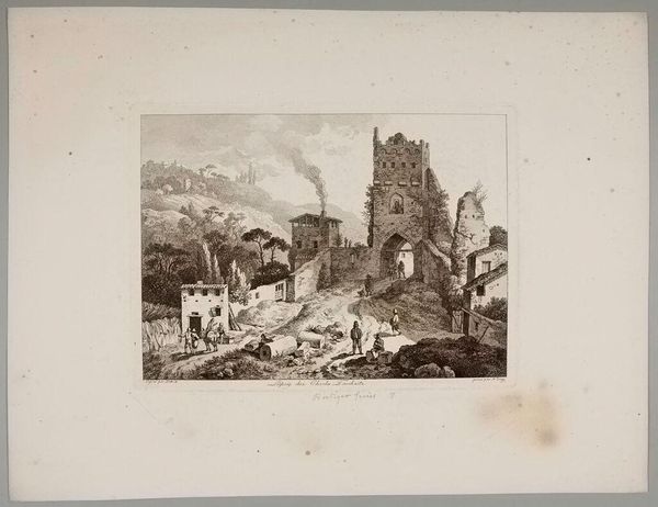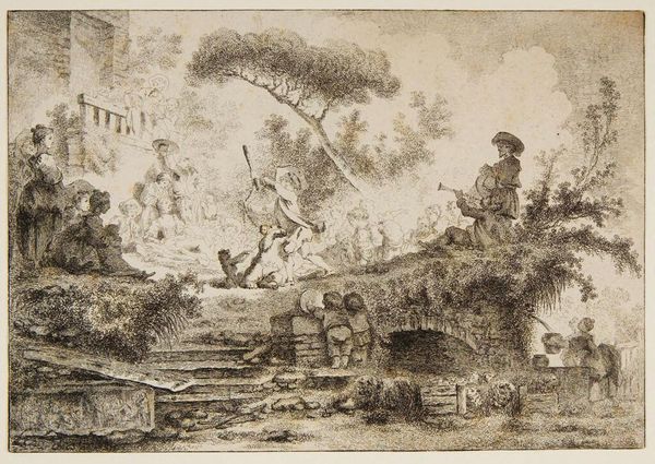 Curator: We're looking at Giovanni Battista Piranesi's "Amphitheater of Pula in Istria near the sea," an etching from 1748. It captures the Roman amphitheater in Pula, Croatia. Editor: Wow, it's intensely evocative, almost gothic. I get a distinct sense of crumbling grandeur and quiet desolation. The details of the stones practically ache with stories. Curator: Absolutely. Piranesi's approach wasn't just documentation; it was commentary. He's playing with themes of decay, time, and the relationship between human ambition and nature. How empires rise and then… this. The overgrown ruins really speak to that cycle, I think, raising questions of transience, even entropy. Editor: It feels like a movie set, a backdrop for some sort of… brooding drama. Maybe a fallen king contemplating his lost kingdom. There is also something hopeful: life reclaims what’s lost through the plants reclaiming those stones, and those small figures inhabiting this immense arena. A story for another day. Curator: Exactly. The people you describe highlight scale and a new socio-political context in relation to historical constructs. Note also how Piranesi used etching and engraving; it was the perfect medium for capturing light and shadow and giving the piece depth. And how the positioning almost emphasizes the amphitheater’s assimilation within nature’s scheme? Editor: His dramatic manipulation creates a dream-like quality, this intersection between past and present; almost surreal. I also like how the tree mirrors the scene’s overall decline. Nature as observer or active collaborator... perhaps both. Curator: Yes. Piranesi forces us to reflect on cultural memory and the cyclical nature of power. The print becomes more than just a picture, it transforms into a statement about civilizations, power, nature, and time’s passage. Editor: I am moved by its strange beauty and the almost palpable weight of time imprinted in those stones, provoking wonder in this melancholic grandeur. A haunted, elegant space.