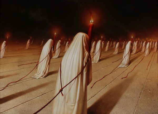 Siegfried Zademack made "Fegefeuer," using a muted palette and meticulous brushwork to depict a mysterious and unsettling scene. The whole thing has this slick, surreal quality, it feels so real it must be synthetic. What strikes me most are the figures draped in white, standing like ghosts, guardians of something... but what? Each figure is meticulously rendered, the fabric cascading with almost sculptural precision. The folds catch the light, giving them weight, presence. Then you notice the slender, candle-topped poles rising above them, tiny flames flickering in the oppressive darkness. The contrast between the solidity of the draped figures and the fragility of those flames is just heartbreaking. It reminds me of some of the stranger, more surreal moments in Philip Guston's later work, that sense of something both familiar and deeply unsettling lurking just beneath the surface. Like Guston, Zademack embraces ambiguity. There's no easy explanation here, and maybe that's the point.