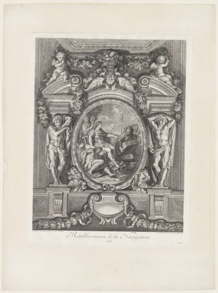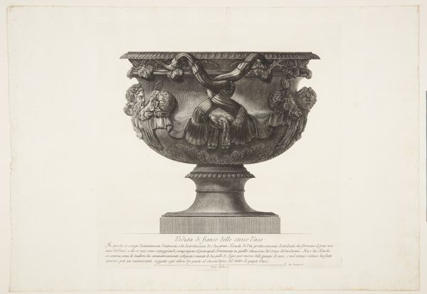 Curator: Looking at this print, my first thought is that it looks like it’s looming. The sheer scale conveyed is overwhelming. Editor: Indeed. We’re looking at "Another view of the same vase as depicted in the preceding etching, seen from below", an engraving by Giovanni Battista Piranesi, created between 1769 and 1778. It's part of the collection here at the SMK. Piranesi really captured the grandeur of the baroque style. Curator: It’s certainly imposing, the low viewpoint exaggerating its size. Notice how Piranesi used extremely precise linework, emphasizing the sculptural details and giving a sense of monumentality. The play of light and shadow adds dramatic intensity. Editor: And Piranesi's focus wasn't just aesthetic. He was actively involved in debates about Roman architectural superiority. Prints like this contributed to a burgeoning public discourse around national identity and cultural heritage. These weren't just beautiful objects; they were political statements. Curator: I'd agree. The vase is clearly the primary focus here, dominating the visual space. And while historical context enriches our understanding, the artist’s careful structuring of the artwork— the proportions, the use of perspective— these elements contribute equally to its profound aesthetic impact. Editor: Precisely, but that aesthetic impact also functions as a sort of cultural propaganda, shaping public perception of Rome’s significance. By glorifying the artifacts, Piranesi promoted a specific narrative about the past. Curator: Perhaps. It’s undeniable that this viewpoint and treatment elevate a utilitarian object into something that’s sublime. The ornamentation itself is highly articulate, note the floral detailing, figures… Editor: Right. He made sure the vase’s role as a status symbol remained apparent, showcasing Rome’s opulent tastes for a wide audience that would mostly see this masterpiece rendered through prints like these, a means for distributing propaganda in the Age of Enlightenment. Curator: Whether intended for propaganda or not, his technical virtuosity remains stunning. Ultimately, Piranesi compels us to reflect on art’s capacity to communicate, provoke, and simply inspire. Editor: Agreed. His work, particularly pieces such as this, shows how art history is never solely about "beauty." Art is fundamentally tied to society, culture, and, as you suggested, to how the cultural narrative inspires our way of seeing and being in the world.