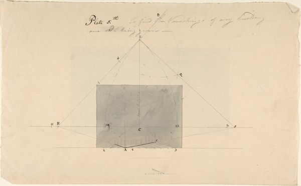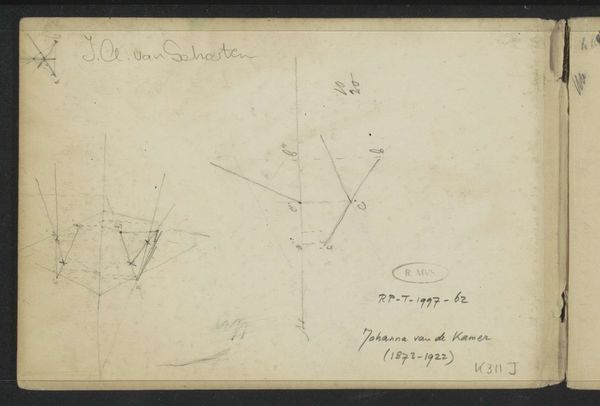 Editor: This is "Perspectiefoefening," a perspective exercise done in ink on paper by Catharina Kemper in 1813. It feels like a page out of a textbook, with careful lines and annotations. What stands out to you? Curator: What strikes me is the power of lines, both written and drawn. Think about it: lines define perspective in this image, creating the illusion of depth. And what do lines of text accomplish? They meticulously define how we should read that depth, creating a cognitive map for the eye. Editor: So, the lines function as guides in two different ways. What do you think Kemper was trying to convey with this, besides just demonstrating perspective? Curator: I see her exploring a concept of order. Consider the social and political climate of 1813. It was a period of upheaval in Europe. Perhaps, through this very controlled depiction of space, Kemper sought to establish a sense of visual and intellectual stability in a world that must have felt incredibly chaotic. Editor: That's interesting – using art as a way to find order amidst chaos. Curator: Precisely. And even the act of handwriting itself, so meticulously practiced, held significance. Calligraphy connects her to generations of learning. This geometric sketch becomes imbued with personal meaning, echoing traditions, but also potentially subverting them in the name of clear scientific observation. What do you think that conveys? Editor: I’d not thought about it as Kemper putting her own spin on tradition. I was mainly concerned with understanding the math, but this connects it to something more tangible, doesn’t it? Curator: Yes, it gives an unexpected insight into both the artistic and the social conventions. There is cultural continuity within that visual framework. Editor: I never thought a math exercise could hold so much symbolic weight!