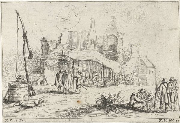 Stefano della Bella created this print, titled Plate 10, as part of his series 'Caprice faict par de la Bella.' Della Bella lived through the Thirty Years' War, and his life experiences shaped his artistic output. In the print, a peasant woman, burdened by a child on her back, walks with the aid of a staff. Behind her, a young boy lies exhausted on the ground. The setting includes other women with children and a distant church, elements that together paint a picture of rural life, yet the image is tinged with hardship. Della Bella's series captures scenes of everyday life infused with the realities of the period, reflecting the trials and tribulations of ordinary people. Through this piece, he offers a glimpse into the lives of those often overlooked, inviting us to consider their struggles and resilience. The image becomes a poignant reflection on the universal themes of motherhood, survival, and the human spirit in the face of adversity.