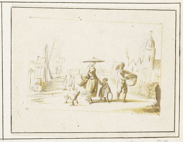 Plate 10: a peasant woman turned towards the right with a child on her back, a boy lying on the ground behind her in center, two women and a child to left in middleground, a church to right in background, from 'Caprice faict par de la Bella' 1640 - 1645