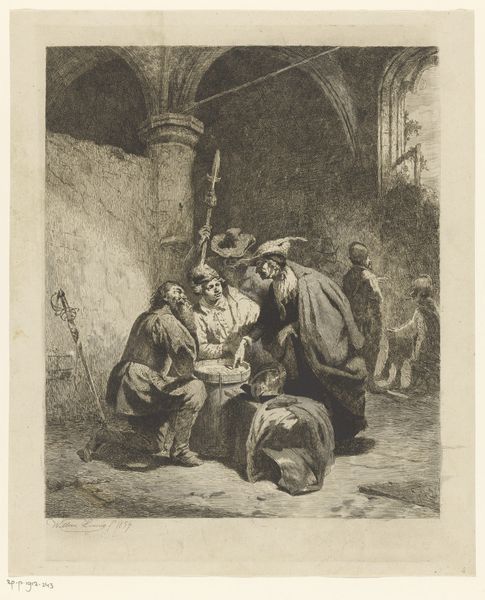Curator: What a fascinating scene of everyday life captured in this drawing by Anthonie van den Bos, dating roughly from 1778 to 1838. It’s titled "Rokende boeren bij een schouw," or "Smoking Peasants by a Hearth" if translated. Editor: The first thing that strikes me is the palpable sense of warmth and stillness. It feels… worn, used, comfortable. It makes me wonder about the working class and their methods and rituals of relaxation after long days of labor. Curator: Absolutely. It provides insight into the social history of labor and leisure during that time. It's worth noting that genre scenes like this also tell us about the social perception, almost a romanticizing of rural life by those with more resources who bought this art. There's an inherent commentary here on class and the division of labor. Editor: Looking at the etching and graphite, I see how the print medium plays a role in circulating images and therefore shaping perception. How were these drawings reproduced and distributed, and for whose consumption? And do you think the rustic aesthetic romanticizes working class exploitation for wealthier audiences? Curator: It does prompt questions about consumption, doesn’t it? These works certainly offered a sanitized vision of peasant life to an urban viewership, one that erased the hardships and amplified the quaint. Editor: Precisely! Consider the construction of “peasant” as an identity, viewed and consumed like any other commodity. The details, from the pipes to the hearth tools, highlight the importance of material culture in understanding labor and class. These were people working closely with objects and each other. Curator: Also think about how this image reflects the relationship between art and politics. What sociopolitical concerns of the period were reflected in its creation and consumption? Editor: Indeed. I also consider if the choice to depict men smoking promotes an aesthetic for laborers; and maybe that habit plays some symbolic role in labor’s leisure. I like that it acknowledges men from the labor force but also makes me wonder if these kind of depictions might be used to perpetuate gender norms of who composes it. Curator: The image gives us more questions to think about regarding this piece than answers. These scenes often serve to solidify social hierarchies and reinforce particular ideals about rural life, masculinity, and work. It shows us how depictions of peasants contributed to their broader cultural representation. Editor: Thanks to these considerations, I have a better understanding now, and the warm stillness I initially saw reveals far more complexity.