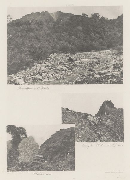 Carl J. Kleingrothe created this photographic print depicting landscapes in Sumatra. The composition is split horizontally, offering two distinct vistas. The upper section reveals rice fields under cultivation, while the lower captures a view of Tongging. Observe how Kleingrothe employs a structured, almost geometric approach in framing the rice fields. The parallel lines of the terraces create a layered effect, leading the eye towards the distant waters. This structured organization contrasts with the more fluid lines of the lower landscape. Here, the undulating hills create a sense of depth, framing the tranquil expanse of water. The restricted tonal range throughout the print emphasizes form and texture. This reinforces a sense of serenity, yet also hints at the constructed nature of landscape as a visual and cultural product. The photograph invites us to consider how we perceive and organize the world around us through visual representation.
