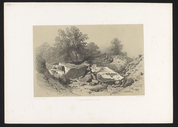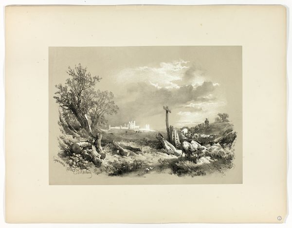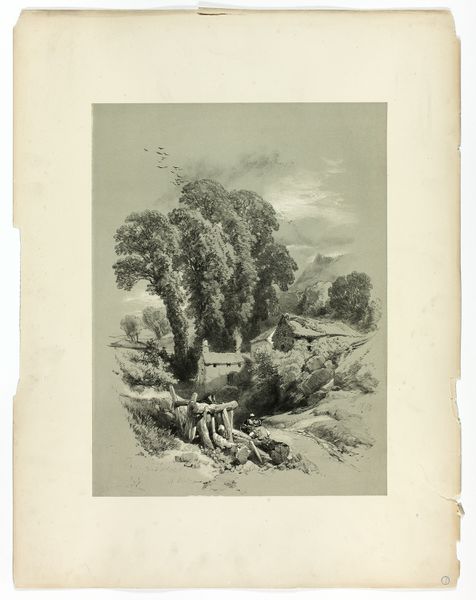 James Duffield Harding created this lithograph, "Bettws, N. Wales, from Picturesque Selections," printed on paper, sometime in the early to mid-19th century. The initial impression is of a serene landscape, meticulously rendered in monochromatic tones, where the detailed textures of foliage and rock invite contemplation. Harding's piece operates within a semiotic framework that uses natural elements to symbolize broader cultural ideals. The sheep, for instance, can be interpreted as signs of pastoral tranquility, an idealized version of rural life. The composition—balancing open space with concentrated detail—reflects a structuralist approach, where each element is interdependent, contributing to the overall harmony and meaning of the work. The lithographic technique itself—with its capacity for nuanced gradations—adds depth and complexity. It invites us to question the relationship between representation and reality. Harding's skilled manipulation of light and shadow not only enhances the aesthetic appeal but also subtly challenges our perceptions, questioning whether we are viewing a literal depiction or a romanticized interpretation.