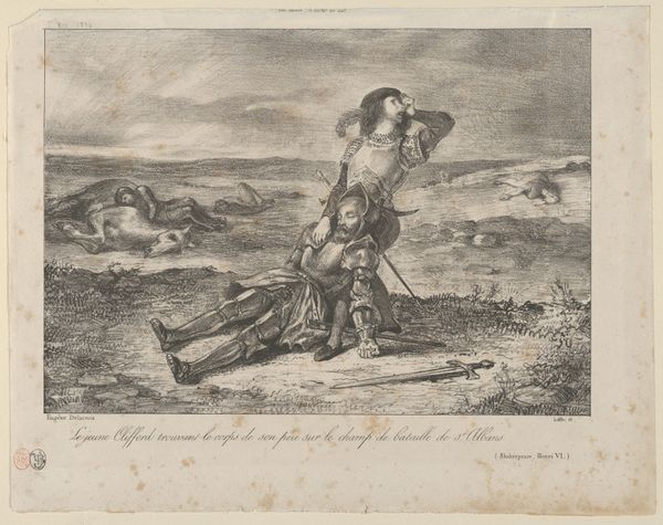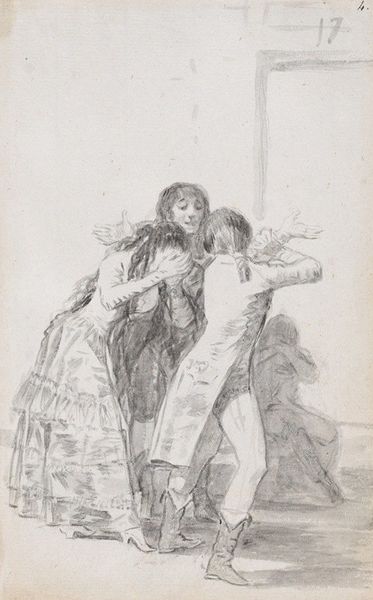 Curator: "Girl on a Swing, a Man with his Arms Raised" is the name of this pencil drawing by Francisco de Goya, created sometime between 1795 and 1797. Goya’s piece shows a woman joyfully swinging through the air as a man looks up at her, arms raised in either admiration or anticipation. Editor: It strikes me as… ambivalent. There’s that central figure enjoying her apparent freedom and lightness, but then the slightly desperate figure below, and other indistinct figures surrounding them. It's as though joy and constraint are intertwined. Curator: The Romantic era certainly explored such contrasts. As we can see, Goya positions this work in a playful, almost theatrical light, reflecting his era’s focus on drama and feeling. Genre painting of this time was meant to comment on public morals as much as capture everyday pleasures. The artist aimed to show society its folly, and in this work we might see commentary on courtship and gendered interactions in 18th-century Spain. Editor: I am interested in those potential interpretations. Perhaps the woman's joyous abandon is not innocent freedom at all, but rather a staged performance within a patriarchal system. Her freedom is enabled and observed; she is simultaneously empowered and constrained. The ambiguity of the male figure’s expression complicates this further. Is it support? Entrapment? Both? Curator: And look closer at Goya’s rapid pencil strokes and shading. These choices bring forth emotional nuance. It's far from the polished commissions that other artists sought from noble houses. These works became part of albums he would not exhibit publicly. Editor: Exactly. Goya's decision to not publicize it lends credence to interpreting "Girl on a Swing" as a critique of the very performances society dictates. Curator: Such a small sketch and yet there is much we can unearth to discover Goya’s political intentions behind even the seeming simplest work. Editor: It truly highlights the complicated power dynamics at play in the art—and society—of his time. This drawing encourages questioning beyond face value.