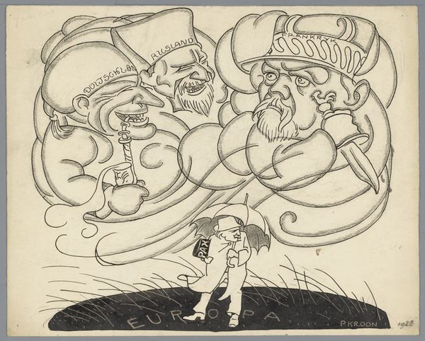 Curator: So, this lively drawing, rendered in ink, goes by the name "Turkije verjaagt Griekenland," or "Turkey repels Greece." Its creator, Patricq Kroon, captured this scene sometime between 1919 and 1922. Editor: It hits you immediately with that almost frenetic energy, doesn’t it? Like a political cartoon set loose with a quill and a dare. There's so much cross-hatching and swirling lines that it feels almost dizzying. The characters have this wonderful caricatured quality; the whole piece evokes chaos and a dark sort of humor. Curator: Absolutely, the artist's mark is undeniably present here. Beyond its aesthetic qualities, though, this piece delves into themes of nationalism and political struggle. Given the timeframe, it directly reflects the Greco-Turkish War, casting Turkey in the role of the triumphant expeller. The caricature would have amplified sentiments that were already present. Editor: Right, and it’s so interesting how the 'high' subject matter of war is presented via this very approachable medium of ink drawing. This challenges these hierarchies we often place on different forms of art. The use of relatively inexpensive and easily accessible materials also makes you wonder about the intended audience and the message’s reach. It almost suggests it would be disseminated among everyday people as part of popular print culture. Curator: Indeed. Looking at the helmet worn by one of the characters, the inclusion of specific details like that hints at the deeper symbolic layer embedded in the scene. Kroon, through his art, captured not just the conflict but also the broader, emotionally charged narrative of the time. And if you look closely, you will see in the caption “De Turk!... Dre helm van Mars zal Constant justje te waat worden!", it means literally 'The Turk!... That helmet of Mars will be blackened Constantinople!’". Editor: It feels like a raw expression of opinion using materials at hand, something that’s both accessible and visually striking. We must think about how labor-intensive print-making was back then. It really emphasizes this incredible investment to make visible a viewpoint and affect an audience’s political perceptions through something that’s immediately arresting to look at. Curator: It speaks to the potent intersection of art, material culture, and sociopolitical narrative—creating a powerful commentary. Editor: A stark reminder of how artistic choices intertwine with tangible material conditions to shape our perception of conflicts and even of our own beliefs.