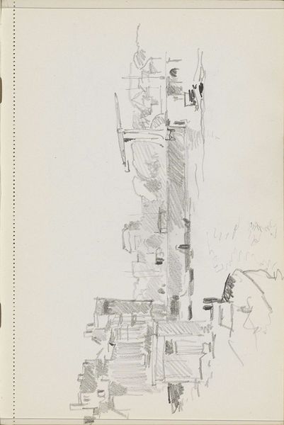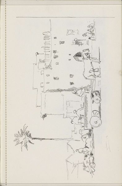 Editor: This drawing by Cornelis Vreedenburgh, dating back to 1936, is called "Figuren op een straat met een moskee" and it's made with graphite and pencil. The architecture gives a strong sense of place, almost like a memory sketched on paper. How do you see the piece? Curator: What strikes me is the deliberate choice of materials, particularly the graphite and pencil. These aren't expensive media, suggesting a certain accessibility, perhaps even urgency in capturing the scene. Given Vreedenburgh's focus on cityscapes, it raises questions about his engagement with the urban environment and the means available to represent it. Editor: So you're saying the drawing's value lies not just in the subject, but in the very act of making it, using accessible materials? Curator: Precisely. And in the Orientalist style which carries its own context. How does this style contribute to or perhaps even challenge our understanding of labor, materiality, and consumption related to art production and the depiction of this Middle Eastern scene? Consider who this work was for, what type of buyer it catered to. Editor: That's a fascinating way to look at it – thinking about who this artwork was made for. So instead of only focusing on what's *in* the picture, we're thinking about *how* and *why* it was created, and the resources that were accessible for it. Curator: Absolutely. This drawing allows us to examine not just the image of a city street, but also the artist's process, the availability of materials, and the social and economic context that enabled its creation. Editor: This definitely opens up a different perspective for me when looking at sketches. It's not just about the final image, but also the story of its production. Curator: Exactly. And understanding that expands our appreciation.