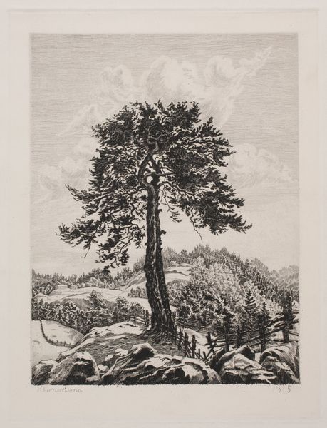 Curator: Ah, another chance to lose ourselves in nature. Today we're observing "Fir Tree," an etching done on paper between 1801 and 1802 by Jacob Philipp Hackert. It now resides at The Art Institute of Chicago. Editor: It’s intensely detailed, almost obsessive in its depiction of the tree’s texture and branching. There’s a feeling of both monumentality and fragility, all rendered with such meticulous precision in etching. It almost feels…oppressive? Curator: I think the detail is quite amazing, actually. Considering etching is a subtractive process, the work Hackert had to put into carving those lines… well, it is hard to ignore. In terms of materials, that kind of paper at the time had a substantial rag content, making it receptive to the fine lines etched from the printing plate. You feel that labor in the visual texture, and in his clear romantic aesthetic. Editor: Labor is exactly what strikes me, not only from Hackert himself, but of nature too. This particular tree looks like it’s seen its share of storms and precarious inclines. Note the detail to the bark of the trunk, how time and place are rendered through the slow touch. And the figures in the landscape. Curator: Yes, there is something slightly dwarfed about those people next to that mighty tree. A bit theatrical, don’t you think? The way the landscape almost cradles them? Editor: Theatre, perhaps, but what kind of stage is this? What is Hackert’s purpose by placing them there? For me, it suggests the raw material as commodity: we're not only looking at Romanticism’s sublime awe of nature, but an artist pointing towards consumption of natural resources. It’s no coincidence that the German Romantic movement overlaps with massive industrial change in Europe, and his landscapes are made via human intervention onto zinc or copper plates, not pure natural touch. Curator: Hmm, food for thought, there. I came thinking it was about the wild soul of a tree, but now you’ve given me the specter of logging practices instead! Editor: Maybe it can be about both at the same time. Nature gives and humans act; a paradox on paper made with earthly means.