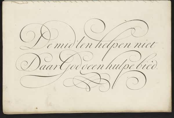 This calligraphic sheet, made by Bastiaan Boers around the turn of the 18th century, presents two Dutch sayings in an elegant, almost performative script. These maxims, one relating to God and the other to the human heart, reflect the importance of religion and moral character in Dutch society at the time. The Netherlands in the late 17th and early 18th centuries was a major economic and cultural power, known for its tolerance and intellectual freedom, though this was a tolerance mainly for people of a similar social standing. The sayings here remind us of a very strong Calvinist presence, one that emphasized personal responsibility, hard work, and a close relationship with God, and which had strong opinions about who could be tolerated into society. A historian seeking to understand this work better would want to delve into the religious and social history of the Netherlands. Examination of sermons, devotional literature, and social commentaries from the period could reveal the precise place of these sayings. Such research might help us understand better the social pressures of this time.