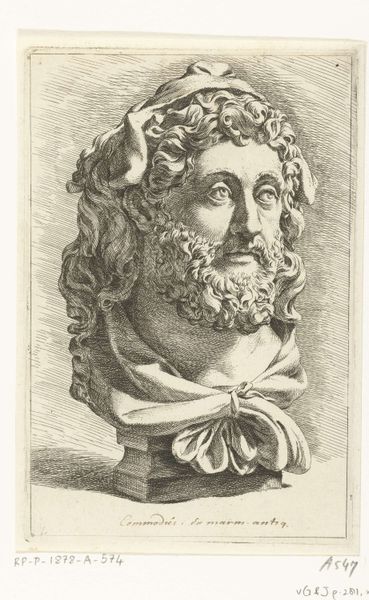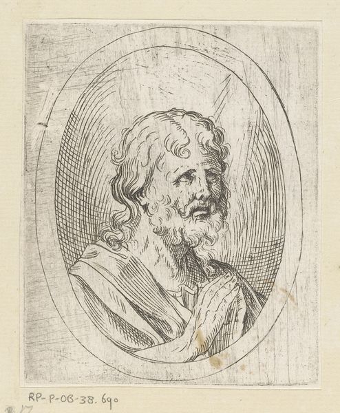Curator: Here we have "The Head of John the Baptist on a Platter," an engraving completed between 1485 and 1490 by the Master of the Amsterdam Cabinet. Editor: Striking. There's a raw intensity to the image, especially in the detailed linework depicting the hair and beard. The presentation on the platter creates an unnerving sense of immediacy. Curator: Indeed. The artist's use of line, specifically, is masterful in defining form and texture. Note the varied weight of the lines—they create a dramatic chiaroscuro effect despite the absence of color. It allows for a powerful, albeit stark, depiction. Editor: From a historical perspective, images like these often served didactic purposes, reminding viewers of the price of righteousness and the dangers of opposing authority. Considering the prevalence of religious and political turmoil in that era, such imagery reinforced social control. Curator: Perhaps. Though I also see a meditation on the body, and its symbolic form. Observe the flatness of the platter juxtaposed with the dynamism of the figure—it is like a prison or frame, creating tension, through shape and form. Editor: It makes me think about the social and cultural value that the medieval people attributed to religion, it also evokes an image of ritual violence; a spectacle presented for a privileged audience who could, then, spread a social or political message. Curator: Precisely. A deeply unsettling commentary conveyed through a precise, yet strangely beautiful, application of line. Editor: An enduring testament to art's capacity to engage with themes of power, faith, and human fragility across centuries. Curator: And through careful formal consideration, to amplify their emotional resonance.