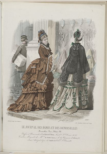 Curator: What strikes me immediately is the carefully constructed scene; it feels like a tableau of Parisian bourgeois life. Editor: That’s a good observation. Let’s delve a bit deeper into that scene. Here we have "La Moda de la Elegancia Parisiense," a print from June 1882 by Edouard Tailland. It was published in "Correo de Ultramar," a magazine dedicated to Parisian elegance. Curator: Visually, it evokes a very specific mood, a mix of aspiration and constraint, if that makes sense. There's a formality even in the relaxed outdoor setting. The woman, her figure elongated by her dress, is juxtaposed against the children with their meticulously rendered outfits and postures. The dog at the lower corner is almost comically active in comparison. What symbols do you recognize? Editor: Well, first and foremost, the clothing itself functions as potent symbolism. Each ruffle, bow, and hat speaks to status, taste, and adherence to prevailing societal norms. There is, I think, also a powerful narrative embedded in the scene as a whole. The group, framed by verdant foliage, signals growth, fertility, but also a cultivated lifestyle away from the bustle of city. Curator: Yes, the outdoor setting is interesting in and of itself. It looks like they might be in a park, an intentionally designed and controlled natural space, very much in line with the constraints we touched on. It almost seems like an artifical world built to display the wealth and power of a certain demographic. I suppose that says a lot about the role of fashion in defining and reinforcing social hierarchy during that era. Editor: I completely agree. Considering this was circulated in a magazine dedicated to fashion, this scene may have aimed at presenting an aspirational vision for readers, even a prescription for conduct and the cultivation of bourgeois values, much beyond mere attire. Curator: Looking at this engraving really highlights how fashion wasn't just about adornment; it was deeply entangled with social and political agendas. Editor: Absolutely. This scene of Parisian elegance offers a rather detailed window into the values and ideals that French society was promoting at that time. It is fascinating to see a set of signs displayed with such deliberate precision.