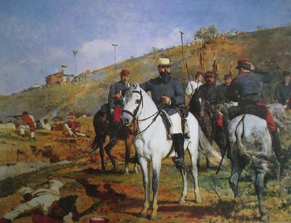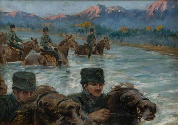 Editor: This is "Transport D'un Blessé," an oil painting by Maximilien Luce. It's mostly muted blues and browns, showing soldiers in the snow. The figures and animals look so weary. What do you see in this piece? Curator: Immediately, I notice the dogs accompanying the soldiers, perhaps symbols of fidelity and guidance. Animals frequently represent the emotional landscape of a painting. What do their presence and posture evoke in you? Editor: Loyalty, mostly, and maybe vulnerability, since they're in such a harsh environment. It's striking how they mirror the weariness of the soldiers. Curator: Precisely. And consider the very act depicted—transporting the wounded. Bearing a burden isn't just physical; it’s psychological and even cultural. What past traumas might be echoed in the representation of injured soldiers, of communal grief and resilience? Editor: It feels like an age-old story—war, injury, resilience—that repeats itself. The snow could be interpreted as nature's indifference, a silent witness to human suffering, or perhaps it is simply a softening of the overall feeling of the piece. Curator: Indeed. Nature often holds dual roles, reflecting our internal states, mirroring both beauty and brutality. It brings a sense of hope to contrast to the men. This interplay is where the image holds its power, doesn’t it? What visual cues contribute to the scene's gravity and possible redemption? Editor: The muted colors create a somber mood, yet the touches of brighter colors hint that light is out there in spite of all that is happening. It shows how closely pain and hope can live together. Curator: It seems there is almost an archetypal narrative playing out. Next time we see a dog in an artwork, we can now maybe recall it and think more deeply of it representing faith, sacrifice, and devotion in times of great upheaval and great pain. Editor: This has really helped me view the artwork with new eyes. Thanks for sharing.