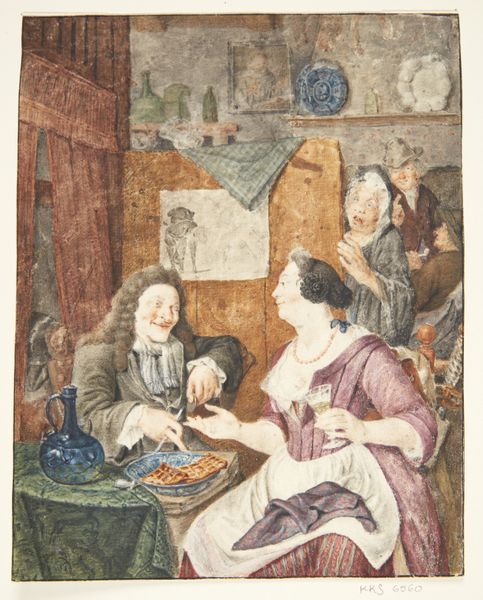 Curator: Here we have "Kitchen Interior," a Baroque-style oil on canvas, which we attribute to Johann Gerlach Lambert. Though undated, the genre painting certainly gives us insight into the everyday life of the 17th or 18th century. Editor: My first impression is the immediacy of the scene. You can almost smell the earthy scent of those vegetables piled so carelessly. It is a portrait, of a room brimming with the raw materials of domestic life, a world unto itself. Curator: Indeed, consider the recurring motifs within domestic spaces during that period, these interiors act as microcosms reflecting the societal values and hierarchies of the time. What does it say to you? Editor: What stands out is how carefully everything is rendered - the smooth pewter of the jug, the crispness of the linens, even the worn wood of the chair. The focus on materiality here suggests a culture deeply invested in displaying and consuming goods. We can ask: Who is doing what here? Curator: Notice, too, how the figures interact. We have different dynamics portrayed among the subjects, a composition that seems designed to hint at individual relationships or even shared social statuses between these characters. This visual language speaks volumes about cultural memory and expectations. Editor: Absolutely. But think about the artist's process here – layering oils to achieve those luminous surfaces, carefully rendering the folds of fabric and glint of metal. And look at the vegetables themselves! Someone cultivated these materials, and Lambert immortalizes them with this labor-intensive method. We have to consider how this reflects social class at the time. Curator: An interesting connection, for sure. The act of depiction elevates these items beyond their utilitarian purpose, embedding them with a significance. Every object, every interaction serves as an anchor in understanding our past. What do we keep sacred? Editor: Yes. In a way, this artwork acts as a snapshot. This allows the modern viewer to analyze labor and material culture centuries ago. What’s even more striking is the fact that many would regard what Lambert does as ‘high art.’ Was that truly the aim when he started painting? Curator: Well, looking at "Kitchen Interior" allows us a glimpse into how even the most humble settings carry narratives rich with symbolic weight. Editor: It reminds us that behind every finished object, every artistic masterpiece, lies a world of materials, labor, and social relations. A materialist's dream come true!