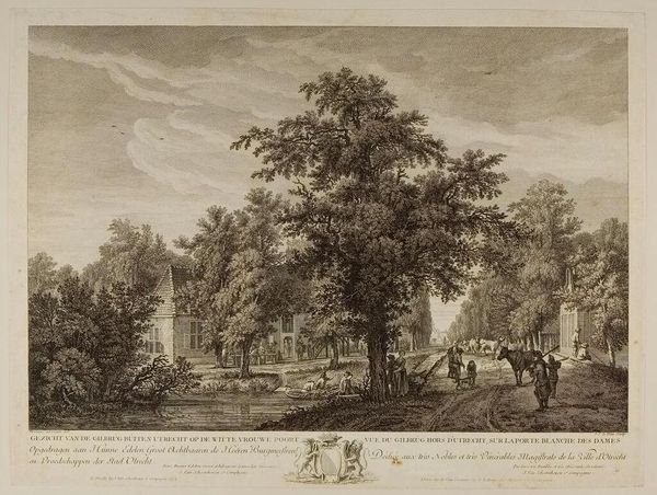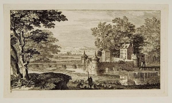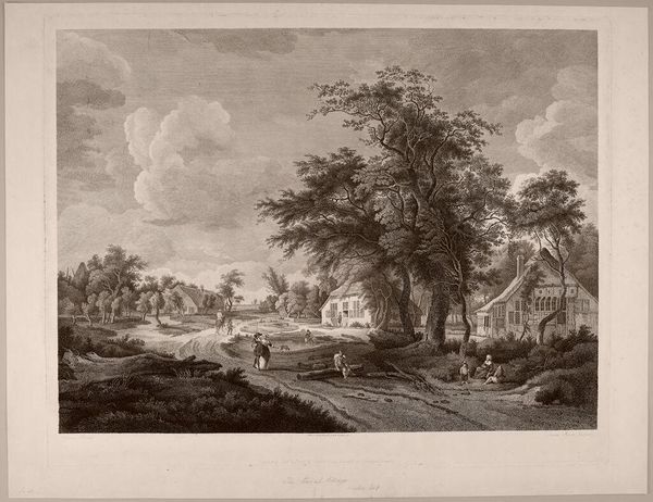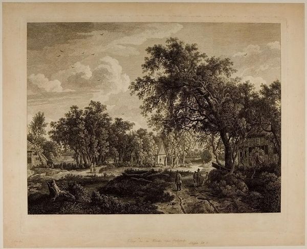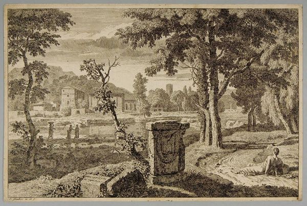 Curator: This is Albert Christoph Dies's "Lake in the Grounds of the Villa Borghese." Editor: It's so meticulously rendered; the trees feel almost architectural in their detail. You can nearly feel the coolness of the water. Curator: Dies, born in 1755, captured the idyllic leisure enjoyed by the elite. The Villa Borghese gardens were designed as a space for pleasure, a theatre for social display. Editor: I'm curious about the etching process here. Look at the fine lines—laborious work used to portray effortless leisure! It also speaks to the engraver’s skill and the consumption of such images. Curator: Exactly. This image circulated, shaping perceptions and solidifying the Borghese family's status. It represents a certain fantasy of Roman life. Editor: A crafted fantasy, made manifest through ink and paper. Considering how it mirrors actual places versus the image itself is rather interesting. Curator: Indeed. We can see how art, even landscape, is always mediated by power and representation. Editor: A valuable reminder of art's complex relationship with both beauty and social dynamics.