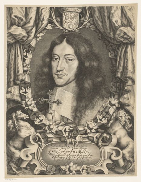 This engraving, created by Pierre Daret, presents René Gentilhomme within an elaborate oval frame filled with symbolic elements. Immediately, one notices the laurel wreath, an ancient symbol of triumph and eternal life, intertwined with musical instruments, signifying harmony and cultural refinement. Consider how the laurel, once adorning the heads of victorious athletes and emperors in ancient Greece and Rome, reappears here, adapted to celebrate the virtues of a 17th-century gentleman. This transformation echoes the cyclical nature of symbols, their meanings shifting yet retaining echoes of their origins. The incorporation of musical instruments further enriches the portrait, suggesting a man of cultivated tastes and artistic sensibilities. Such imagery taps into a collective memory, evoking a sense of sophistication and intellectual pursuit. Just as the Renaissance artists drew inspiration from classical forms, Daret uses these enduring symbols to imbue René Gentilhomme with a timeless aura of dignity and grace, engaging viewers on a profound, subconscious level. The progression of these symbols is never linear; they resurface, evolve, and take on new meanings, weaving a complex tapestry of cultural memory.