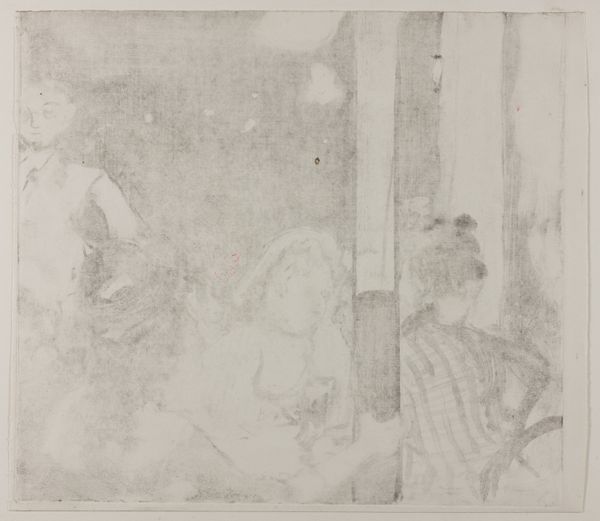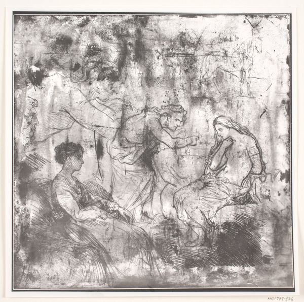 Editor: We’re looking at “Artist Working from a Female Nude Model” by Jan Toorop, a pencil drawing on paper from 1901, held at the Rijksmuseum. The piece shows two figures, one nude and seated, the other, an artist at work. There's something intimate and quiet about the scene. What do you see when you look at this drawing? Curator: Formally, I am struck by Toorop’s use of line. Notice how the varied pressure and density create depth and texture. The contrast between the more defined figure of the model and the sketchier depiction of the artist is key. Consider how this delineation influences our reading of subject and object. Is it representational or stylized? Editor: I see what you mean about the difference in linework. So, are you suggesting the sketchier lines of the artist make her seem less real than the model? Curator: Precisely. The model exists in the foreground and is further defined through a tonal shift—it moves to a softer grade pencil, whereas the artist appears further back as a conceptual idea. But I think it would be fruitful to explore the construction of gaze: how does the artist's perception affect our perception, and vice versa? How is her gaze flattened with hatching strokes and brought back into realism with softer lines? Editor: That's a fascinating perspective; the different treatments of the figures and gazes completely escaped me initially. It changes my understanding of the dynamic of the piece. Curator: I believe, understanding these choices heightens our grasp on its visual rhetoric. Each carefully weighted value choice reinforces both a push and pull, as in how you move forward in space through the gaze and backward into space by the change in medium to paper and pencil. Editor: I see it now; looking closer and being aware of line weights, and medium completely change how to view Toorop's work! Thanks so much for breaking this down for me!