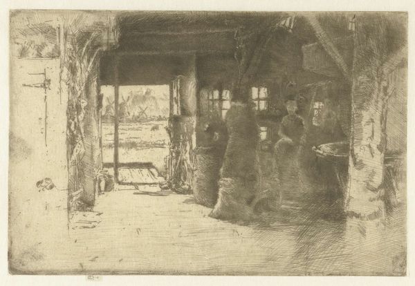 Editor: So, this etching is called "Wheelwright" by James McNeill Whistler. The scene depicts laborers inside a workshop, and the lines really emphasize the grit and hard work. What’s your take on it? Curator: It’s fascinating to consider Whistler, often celebrated for his aestheticism, depicting such manual labor. The etching process itself, the biting of the plate, mirrors the harshness of the work. How does Whistler elevate this scene, moving it beyond mere documentation of labor? Editor: Maybe by showing the beauty in their process, in the repetitive nature of crafting wheels. Curator: Exactly. It challenges the traditional hierarchy that separates ‘fine art’ from the more hands-on crafts. It makes you think about the value of labor, doesn’t it? Editor: It really does. I'll definitely look at etchings differently now!