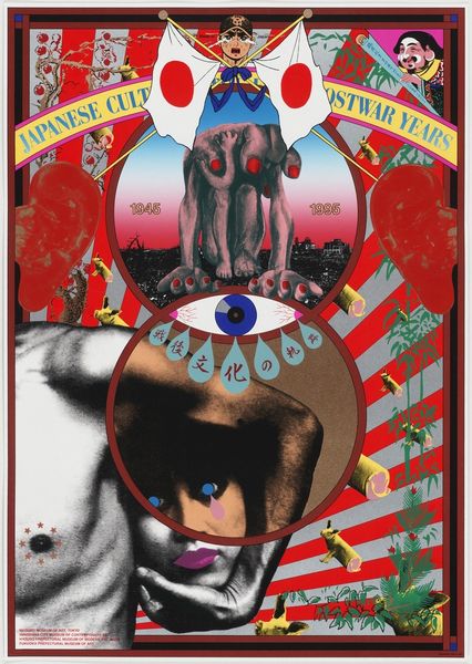Curator: This powerful image, "Japan Relief for Cambodia" from 1993, is a mixed-media collage by Tadanori Yokoo. The poster utilizes diverse symbolic and representational strategies. What strikes you initially about it? Editor: Immediately, the composition overwhelms me with both sorrow and a sense of fractured hope. The intense gaze of the disembodied eyes feels accusatory. There’s also an unsettling duality created by the fiery elements contrasted against what looks like a radiant burst of energy behind the map. Curator: It certainly has many layers to unpack. This work comes at a time of significant political and social upheaval in Cambodia, and Yokoo is directly responding to this. The use of hands holding the map acts as both a gesture of giving but also of control, wouldn't you agree? There's an orientalist framework at work too. Editor: I think I see what you mean. The map radiating with light evokes images of salvation, but at the same time it appears vulnerable and small in the face of looming scrutiny, almost like an offering to some omniscient and judgmental authority. It seems deeply tied to specific cultural anxieties about intervention and aid. Curator: Exactly. It's a commentary on the relationship between Japan and Cambodia and it complicates traditional notions of humanitarian aid. The fragmented and dreamlike quality of the overall design seems to intentionally challenge our preconceived notions of what it means to 'help.' Editor: And these elements also create an intense feeling of visual disjunction, not unlike the chaotic circumstances perhaps that led to this call to relief. Curator: The layering of images and textures also nods towards pop art. The artist strategically plays with cultural symbols to provoke viewers into considering these themes through new ideological perspectives. The bright hues belie the serious context of disaster relief efforts. Editor: Thank you, I think I see that layering now. It certainly creates a powerful experience beyond a first glance. Curator: It's these multilayered dimensions which encourage viewers to see international relations and aid through a sharper lens. Editor: And it does all this by relying on very accessible, universal symbols. Interesting to consider.