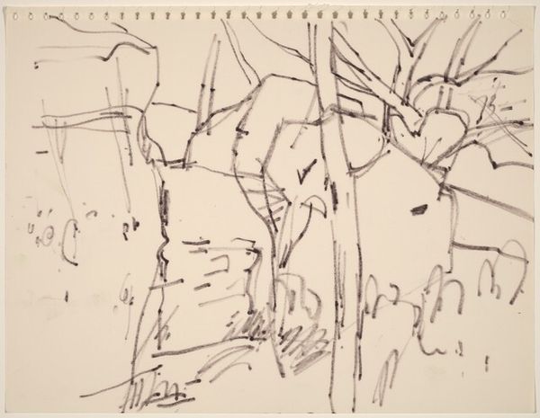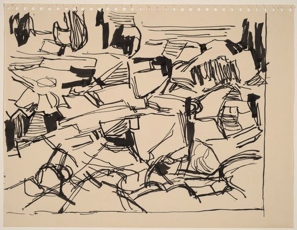 Editor: We're looking at an untitled pen and ink drawing by George Bunker, created around 1969. I'm struck by the apparent chaotic nature of the lines, yet there’s a distinct sense of landscape… almost like a memory of a place. How do you interpret this work? Curator: The beauty here lies in the social and artistic context of its creation. Think about the late 60s – a time of massive social upheaval, the Vietnam War, Civil Rights protests. Abstract Expressionism, though seemingly apolitical, provided an outlet for anxieties and frustrations not easily articulated. Does this drawing offer an escape or a confrontation of these anxieties? Editor: That's a powerful perspective. I hadn’t considered the turbulent social climate influencing something so… abstract. I was too focused on the "what" instead of the "when." Curator: Exactly! The "when" informs the "what." Consider how the proliferation of images – newspapers, television – during that time saturated the public consciousness. Artists, like Bunker, were responding to this visual overload, often fragmenting and reassembling images in ways that challenged conventional representation. Does the seeming chaos relate to information overload? Editor: Possibly. It's as if the drawing mimics the feeling of being overwhelmed. Now I see how Abstract Expressionism isn't just about individual expression but also about a shared societal experience, interpreted through a unique artistic lens. I see now the way Abstract Expressionism challenged the museum as an institution that previously only prized rigid art definitions. Curator: Precisely. It forces institutions to adapt to art's continuous role in responding to the world, doesn't it? Editor: It definitely does! Thanks, I'll have to look at artwork through that lens from now on!